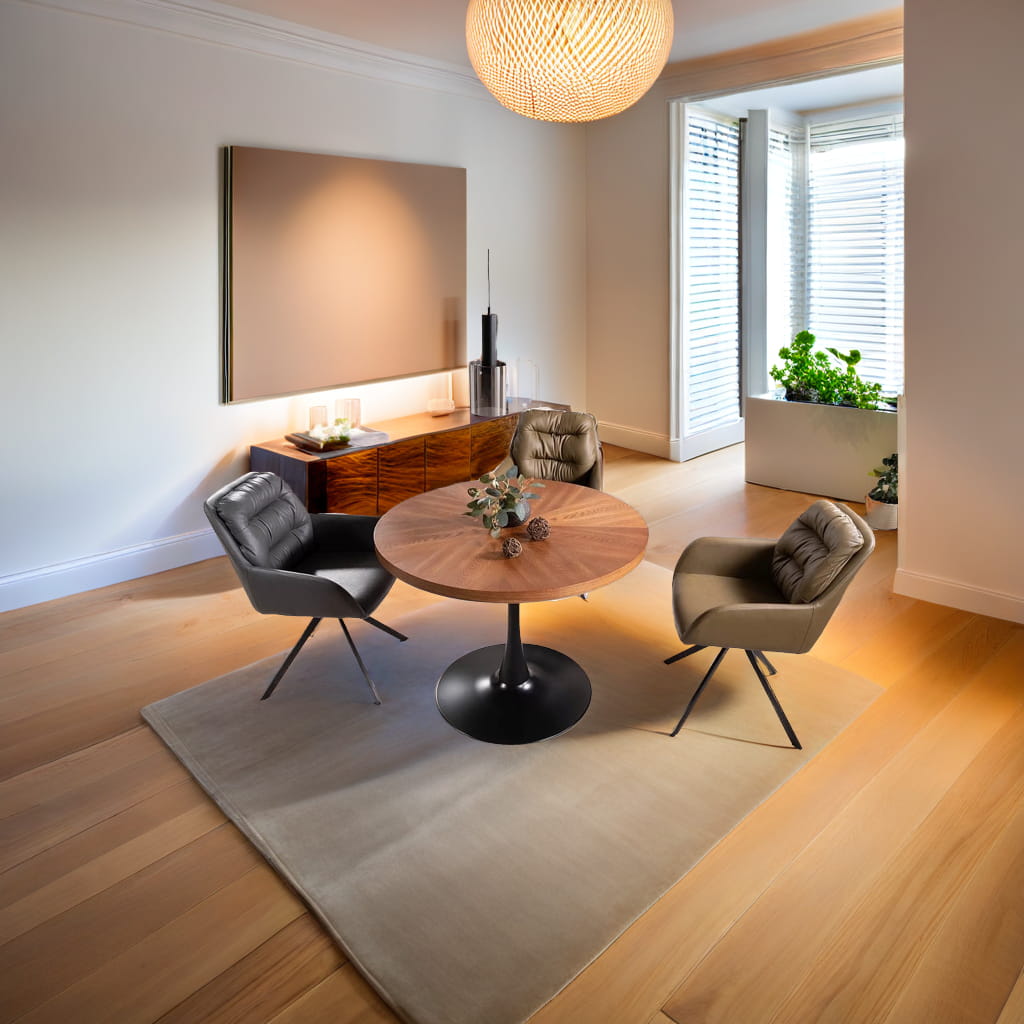 AMADEO to stylowy okrągły stół do jadalni lub salonu, który zachwyca swoją prostotą, a jednocześnie podkreśla elegancję wnętrza. Blat z MDF w okleinie orzechowej wprowadza do pomieszczenia przytulność, podczas gdy czarny stelaż z metalu dodaje nowoczesnego sznytu.