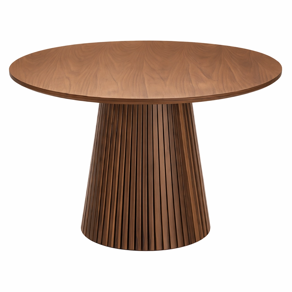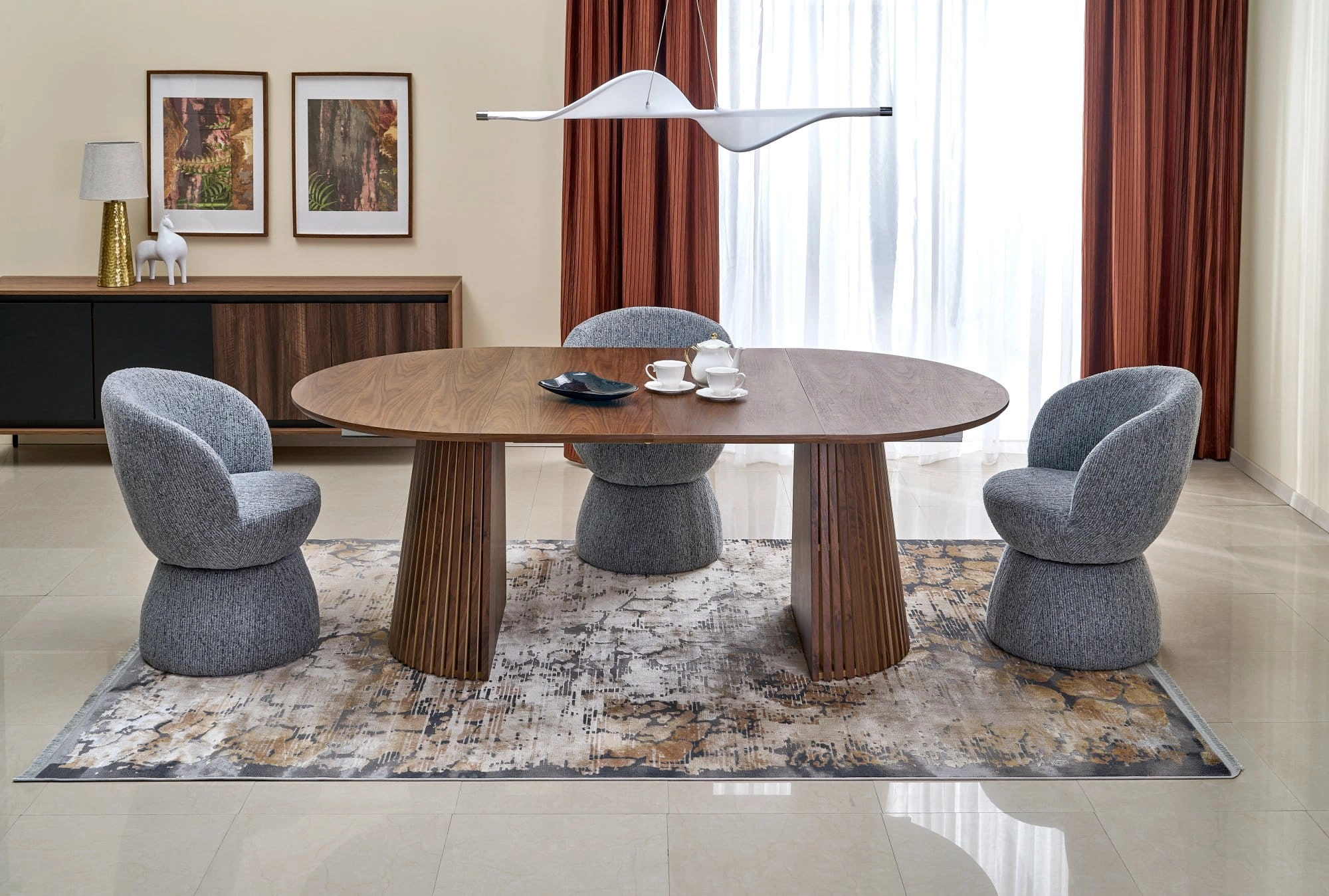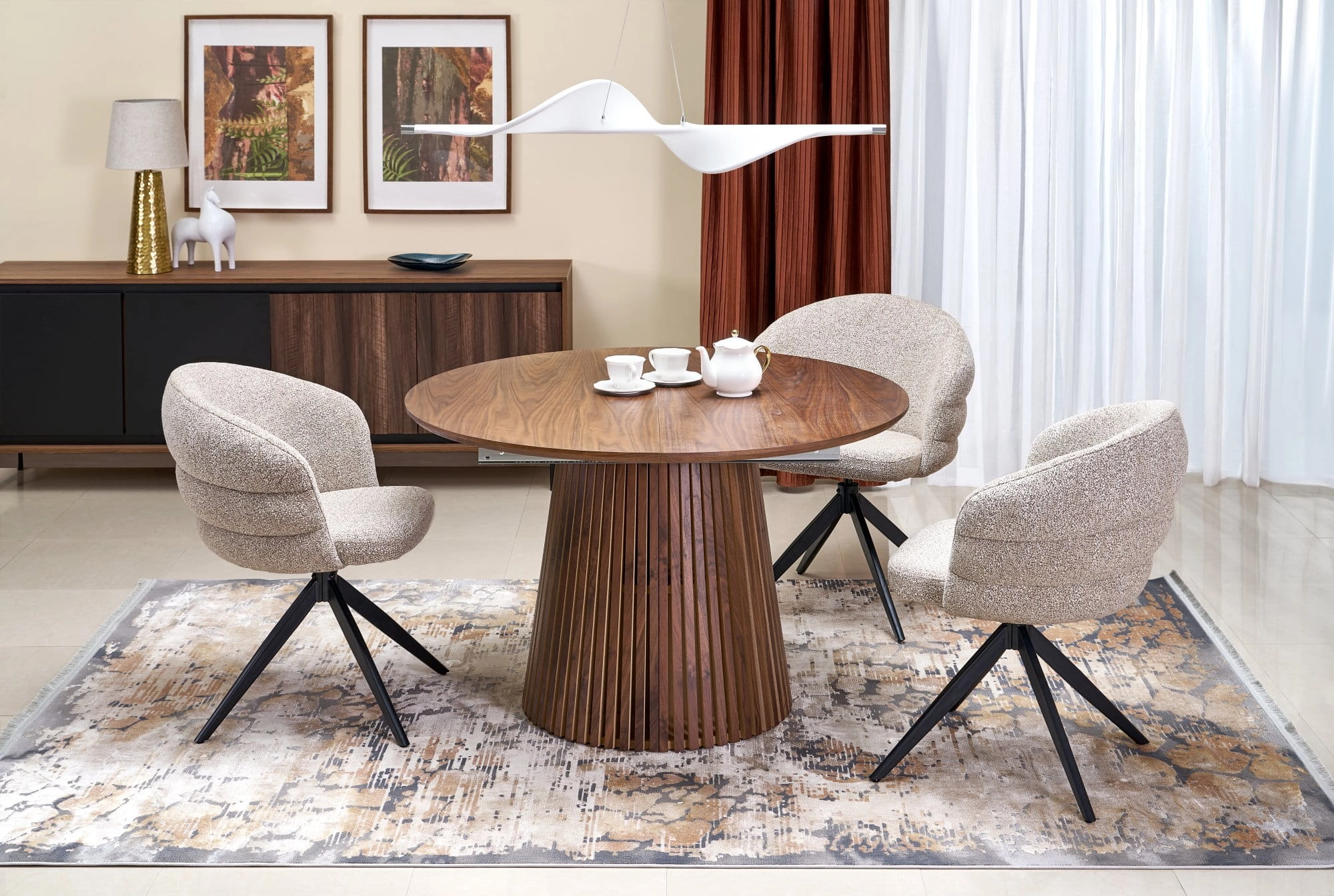 Orzechowy kolor i matowe wykończenie sprawiają, że ten stół do jadalni rozkładany dobrze komponuje się z jasnymi, beżowymi, czarnymi i tapicerowanymi krzesłami. To okrągły stół do salonu, który nie dominuje wnętrza, ale porządkuje przestrzeń i tworzy naturalne centrum domowych spotkań.