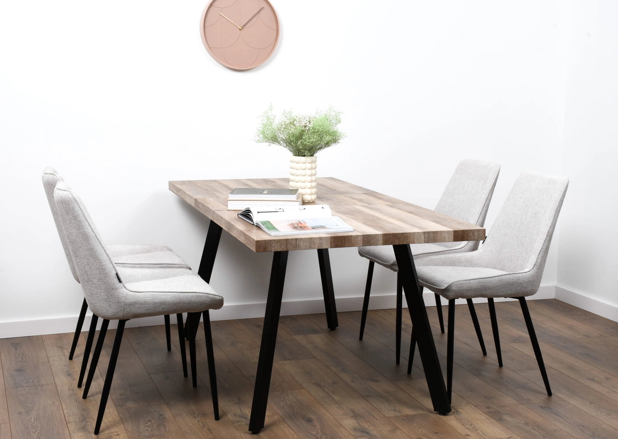 Stół rozkładany DIEGO to połączenie funkcjonalności i elegancji, które idealnie wpisuje się w aranżacje nowoczesnych wnętrz. Dzięki blatowi w kolorze dębu i solidnym metalowym nogom, stół nie tylko pięknie się prezentuje, ale także gwarantuje trwałość i stabilność na lata. Mechanizm rozkładania pozwala szybko powiększyć przestrzeń stołu, co czyni go niezastąpionym podczas spotkań w większym gronie.