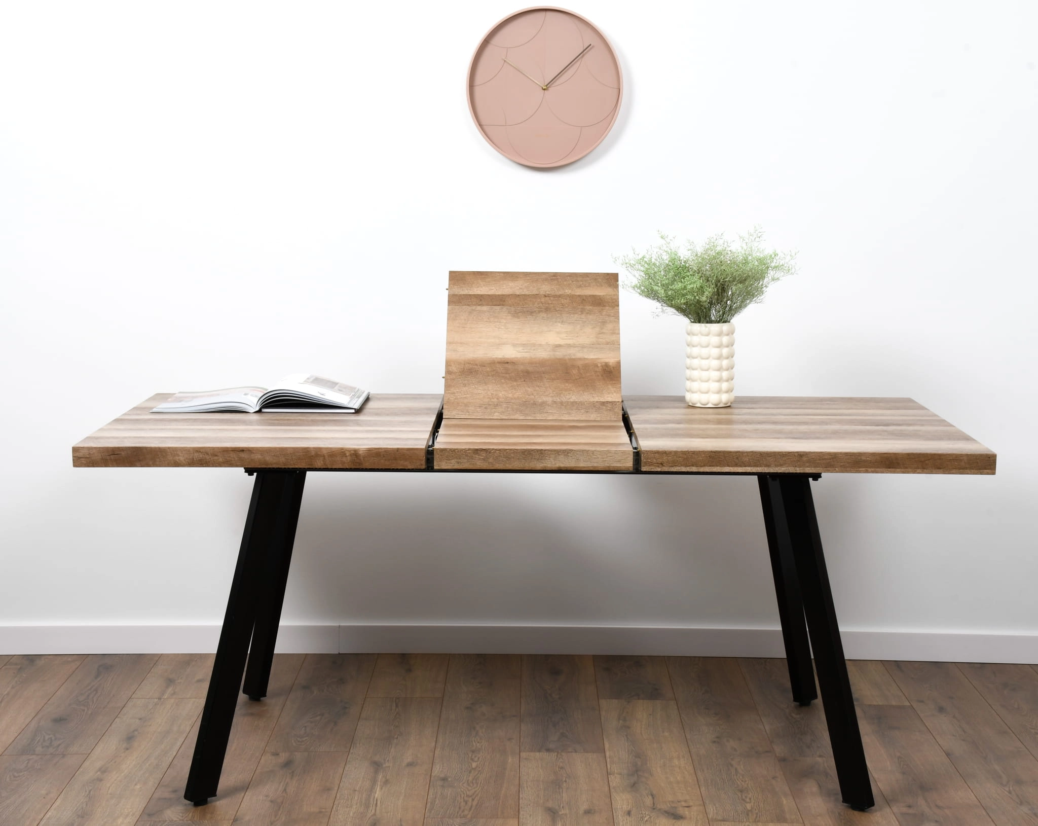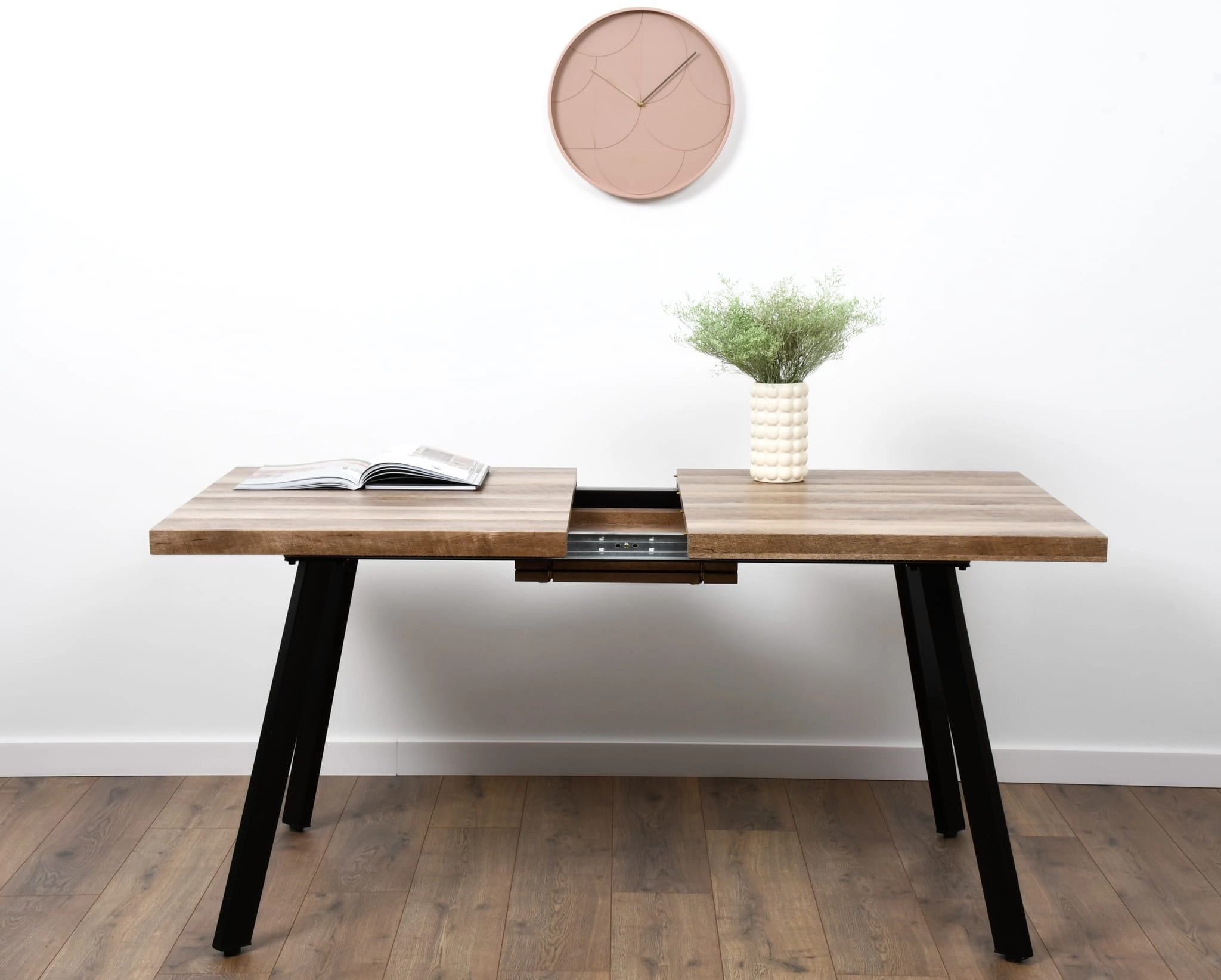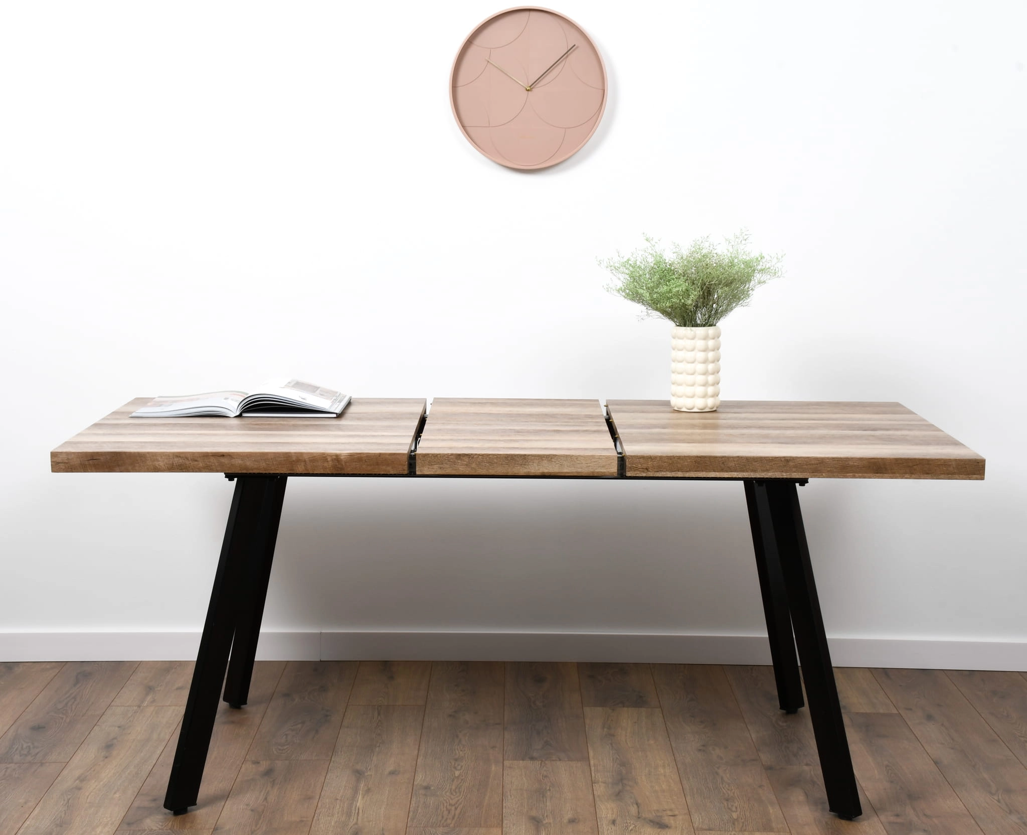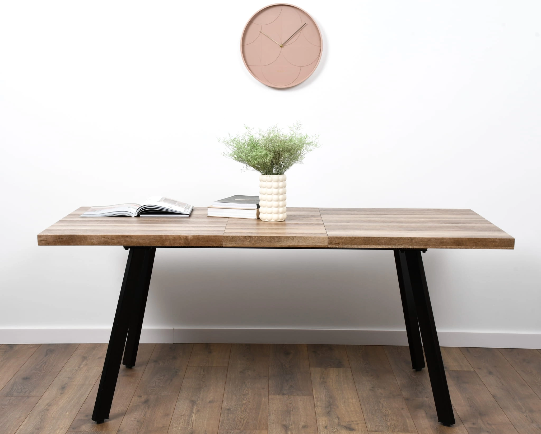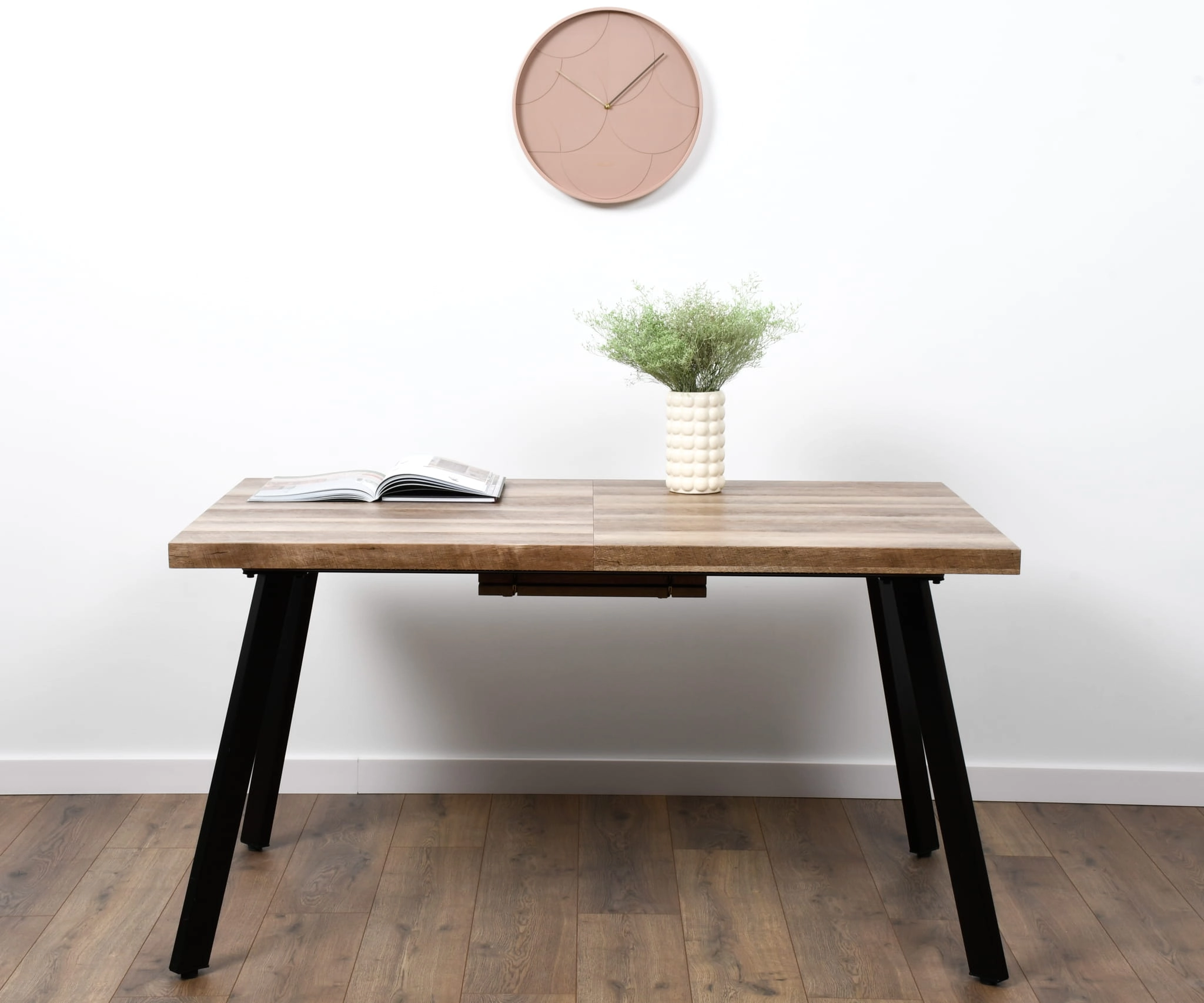 Stół rozkładany DIEGO to propozycja dla osób, które cenią sobie elegancję, praktyczność i solidne wykonanie. Dzięki swojej formie i materiałom świetnie wpisuje się w nowoczesne, industrialne oraz minimalistyczne aranżacje wnętrz. Blat w kolorze naturalnego dębu ociepla przestrzeń, a metalowe nogi w kolorze czarnym nadają mu charakteru loftowego.