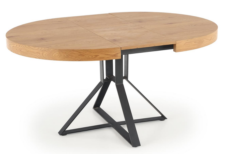 MERCY harmonijnie łączy ciepło dębu złotego z graficzną linią czarnego stelaża. Na co dzień kompaktowy, a w kilka chwil zamienia się w stół rozkładany idealny na uroczyste kolacje. Okrągła bryła sprzyja integracji, a po rozsunięciu zyskujesz wygodę serwowania potraw i swobodę ustawienia nakryć.