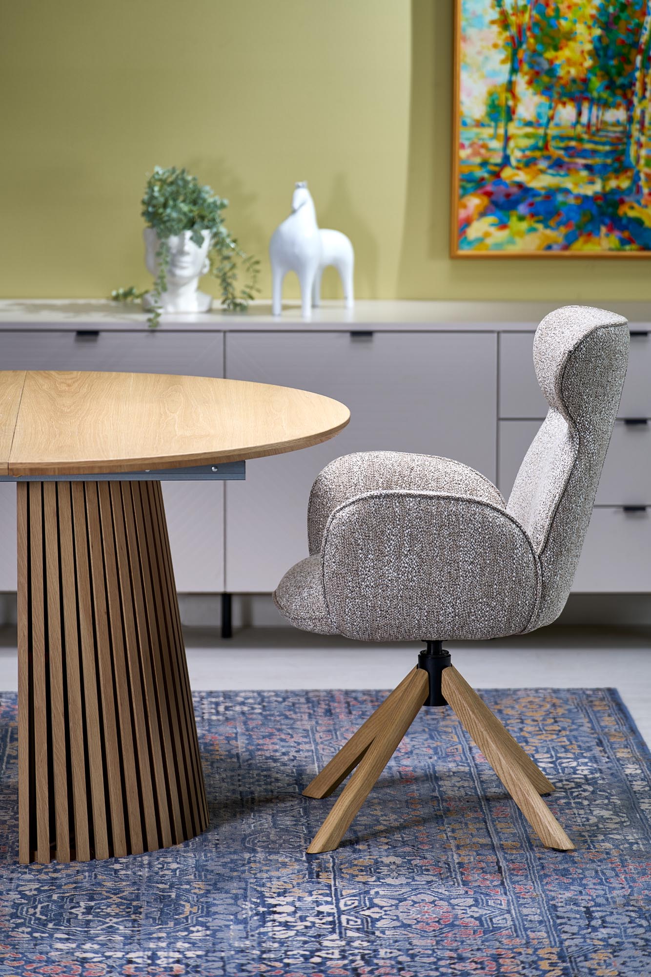 Stół rozkładany okrągły FARGO to propozycja dla osób, które cenią sobie wygodę, naturalne materiały i stylowy design. Jego blat wykonany z MDF pokrytego naturalną okleiną zachwyca subtelnym kolorem i matowym wykończeniem, które nadaje wnętrzu przytulności.