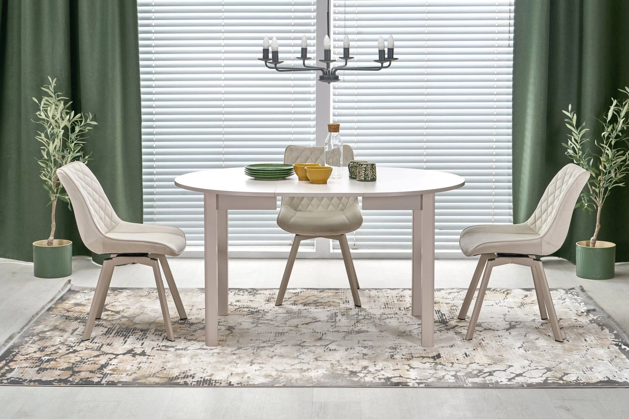 Kaszmirowy odcień dodaje wnętrzu lekkości i miękkości wizualnej. Dobrze współgra z krzesłami w kolorze beżowym, cappuccino, szarym, czarnym lub jasnym drewnie. Możesz zestawić go z tapicerowanymi krzesłami, lampą wiszącą nad blatem, lnianym obrusem, ceramicznymi dodatkami i dekoracyjną paterą, tworząc spójną strefę jadalnianą bez efektu ciężkości.