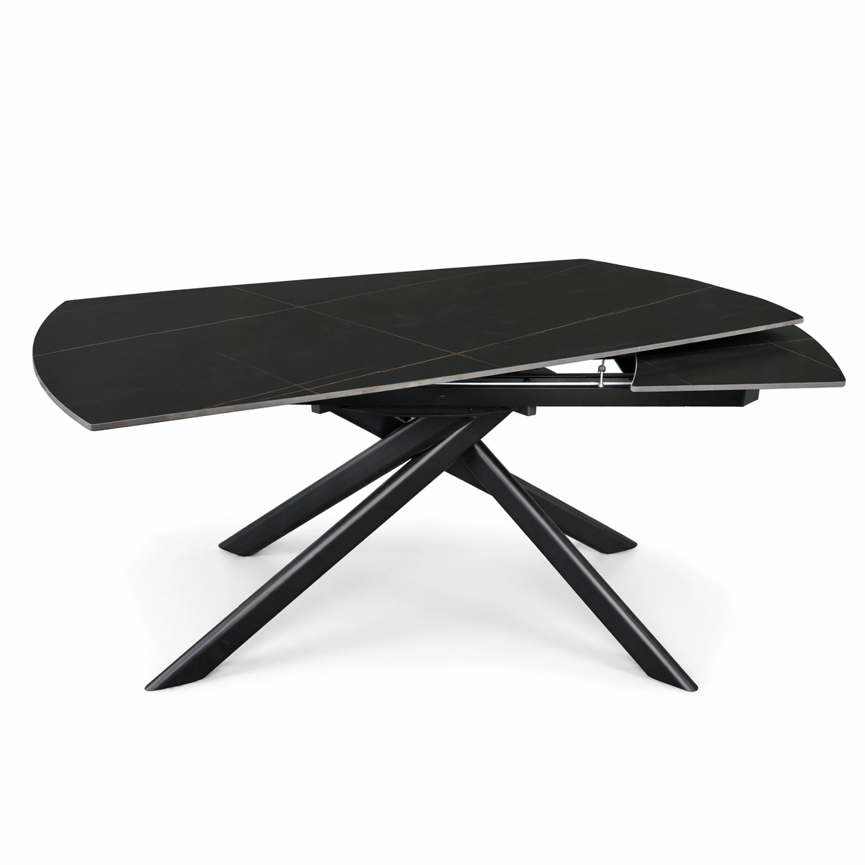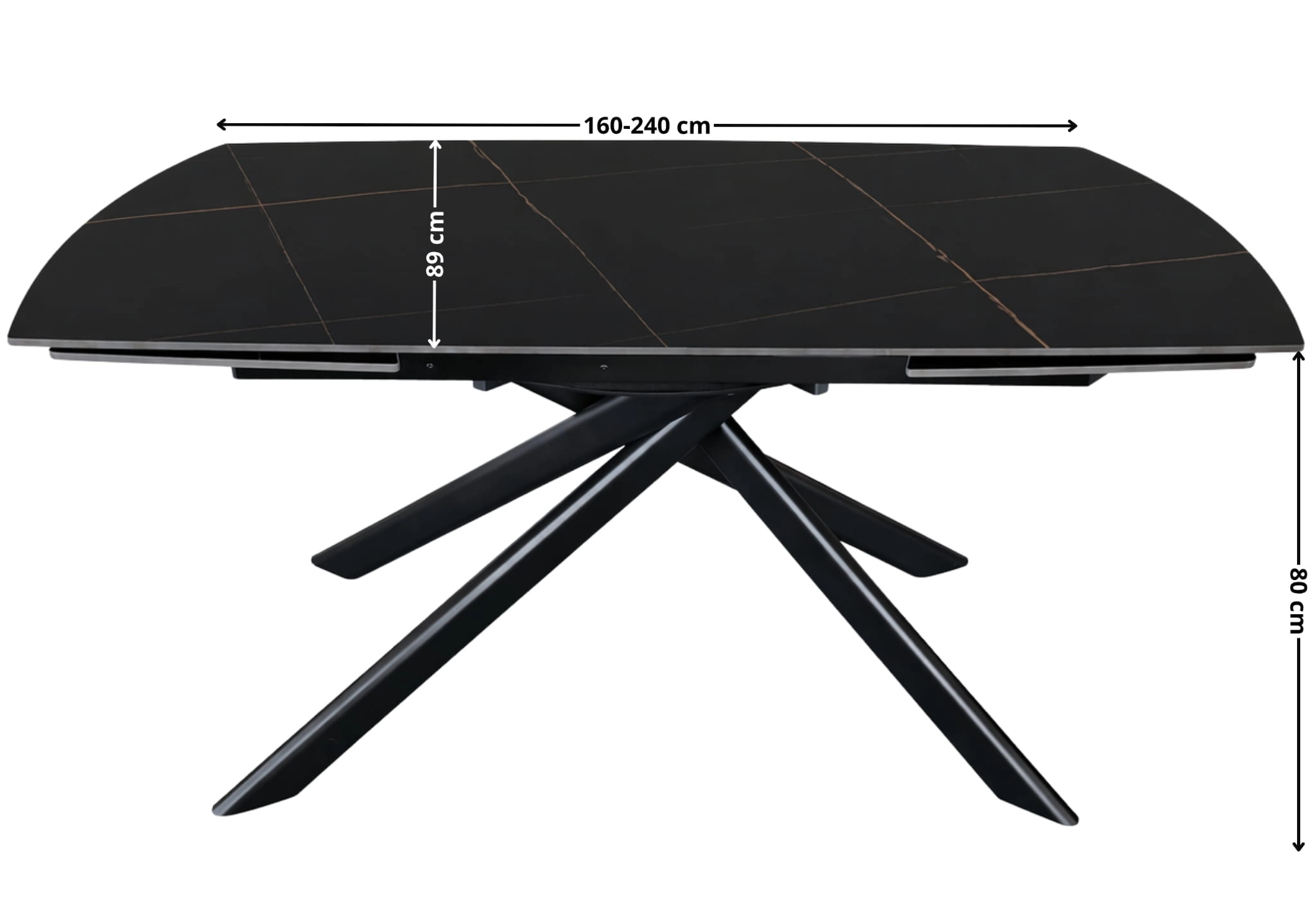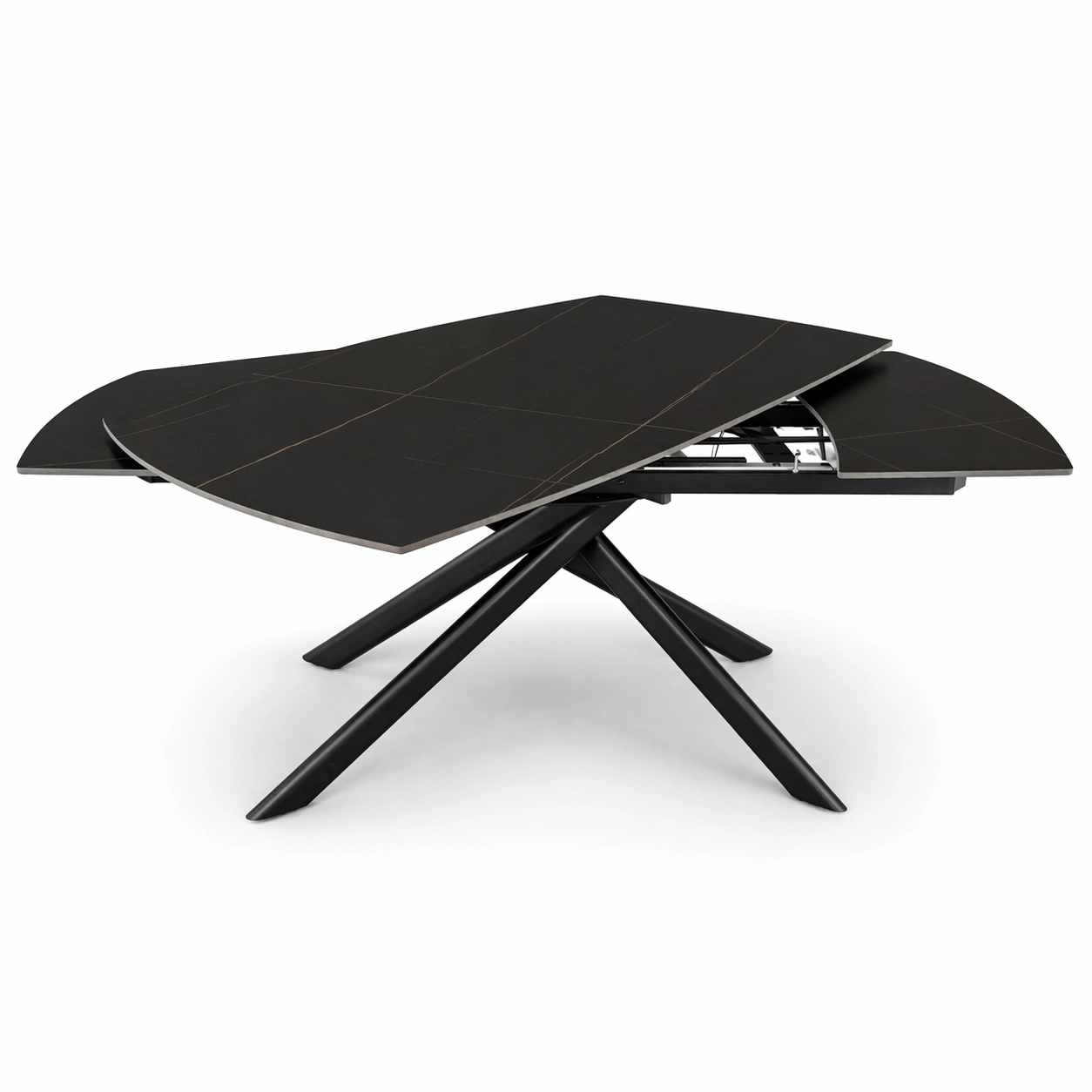 NERON to stół rozkładany, który od razu przyciąga uwagę ciemnym ceramicznym blatem i dynamiczną, krzyżową podstawą z metalu. Na co dzień sprawdzi się jako nowoczesny stół do salonu lub jadalni, a kiedy pojawią się goście, obrotowy mechanizm rozkładania pozwala szybko powiększyć blat ze 160 cm do 240 cm.