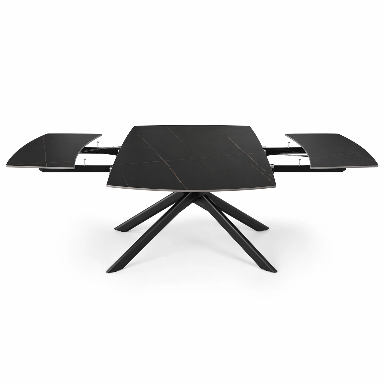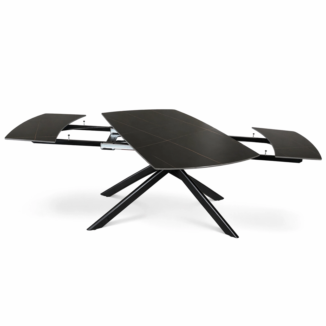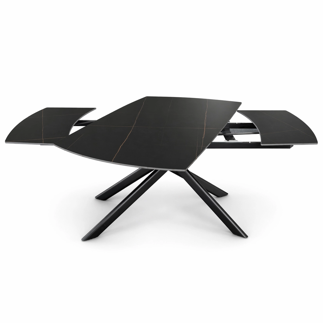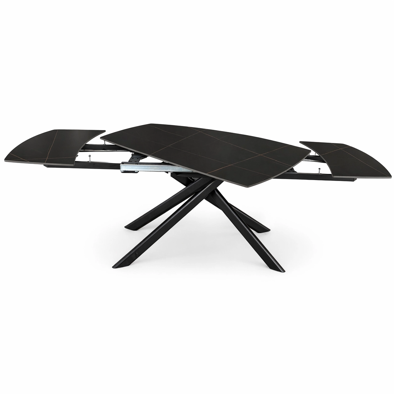 NERON to stół rozkładany, który od razu przyciąga uwagę ciemnym ceramicznym blatem i dynamiczną, krzyżową podstawą z metalu. Na co dzień sprawdzi się jako nowoczesny stół do salonu lub jadalni, a kiedy pojawią się goście, obrotowy mechanizm rozkładania pozwala szybko powiększyć blat ze 160 cm do 240 cm.