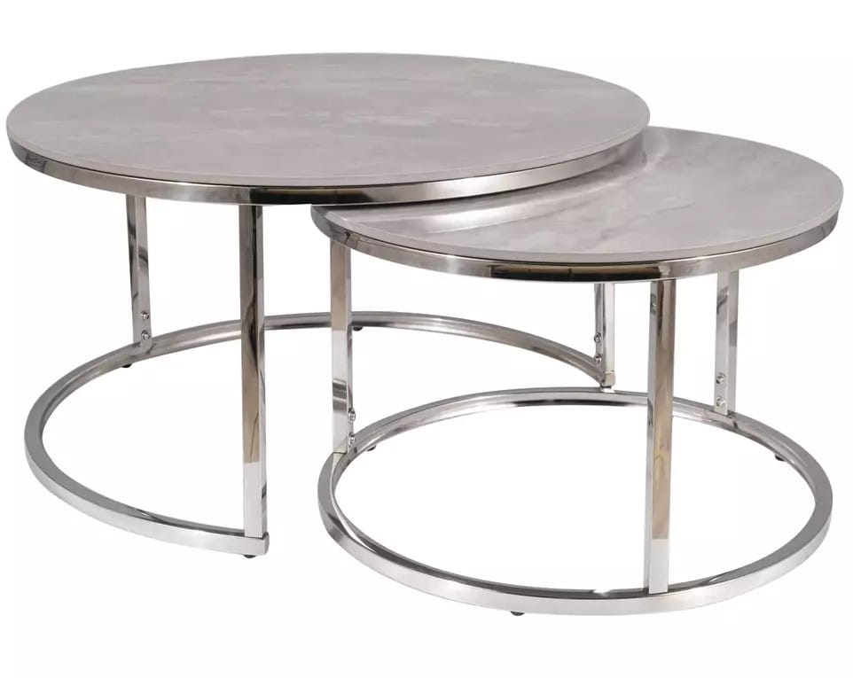 Zestaw stolików kawowych PORTAFINO B to połączenie estetyki i funkcjonalności, które idealnie odnajdzie się w nowoczesnych wnętrzach. Okrągłe stoliki kawowe z ceramicznym blatem w szarym połysku subtelnie podkreślają charakter salonu. To rozwiązanie dla osób, które szukają nowoczesnego stolika kawowego do salonu o ponadczasowym wyglądzie.