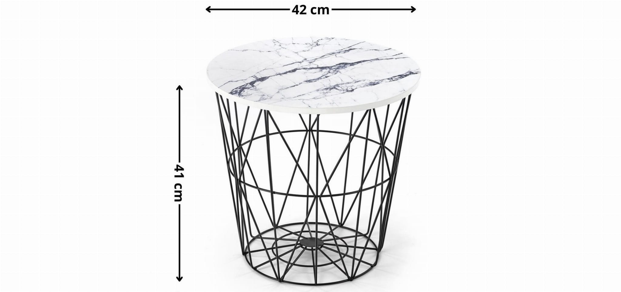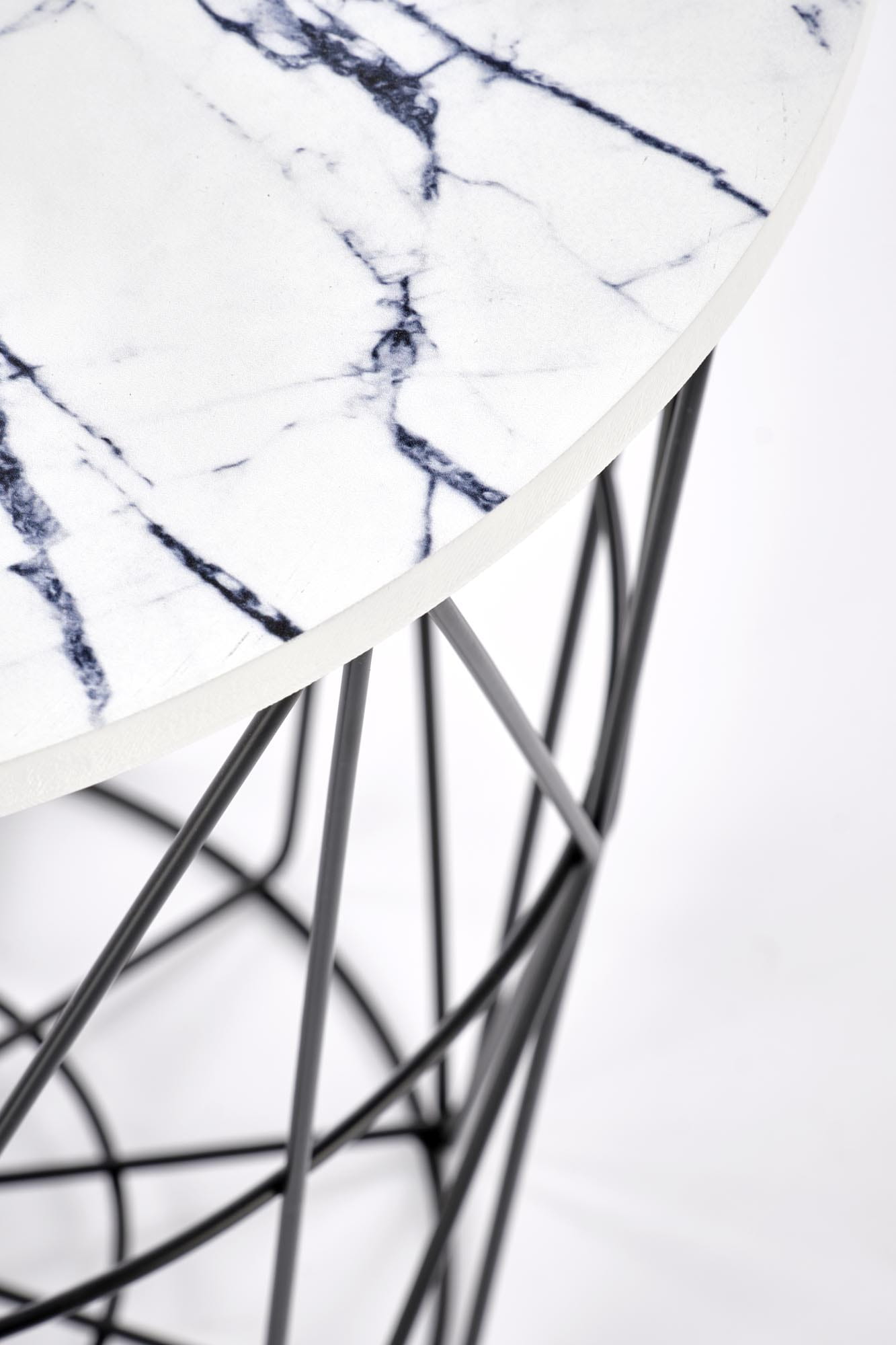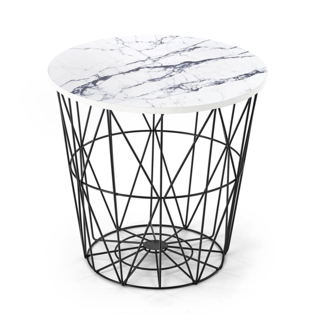 Stolik kawowy HARISSA B biały marmur czarny to designerski mebel, który doda klasy każdemu wnętrzu. Okrągły blat w wykończeniu przypominającym biały marmur w połączeniu z solidnym, czarnym stelażem ze stali malowanej proszkowo tworzy harmonijną całość, wpisującą się w najnowsze trendy aranżacyjne. Dzięki średnicy 42 cm idealnie sprawdzi się nawet w mniejszych przestrzeniach, zachowując funkcjonalność i styl.