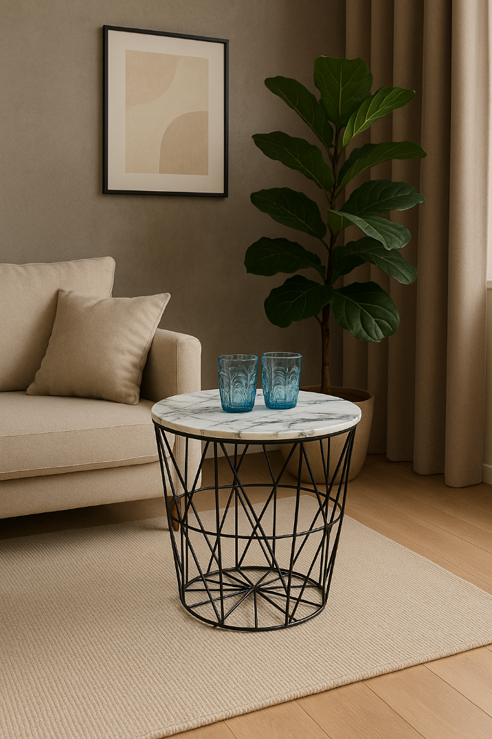 HARISSA B to idealny wybór dla osób, które cenią sobie nowoczesny design i wygodę użytkowania. Okrągły blat w kolorze białego marmuru nadaje wnętrzu elegancji i lekkości, natomiast stabilna konstrukcja z czarnej stali gwarantuje trwałość przez wiele lat. Kompaktowy rozmiar pozwala łatwo wkomponować stolik zarówno do większych, jak i mniejszych aranżacji. To świetne rozwiązanie do ustawienia kawy, książek czy dekoracji, które dzięki temu stolikowi zawsze będą prezentowały się wyjątkowo.
