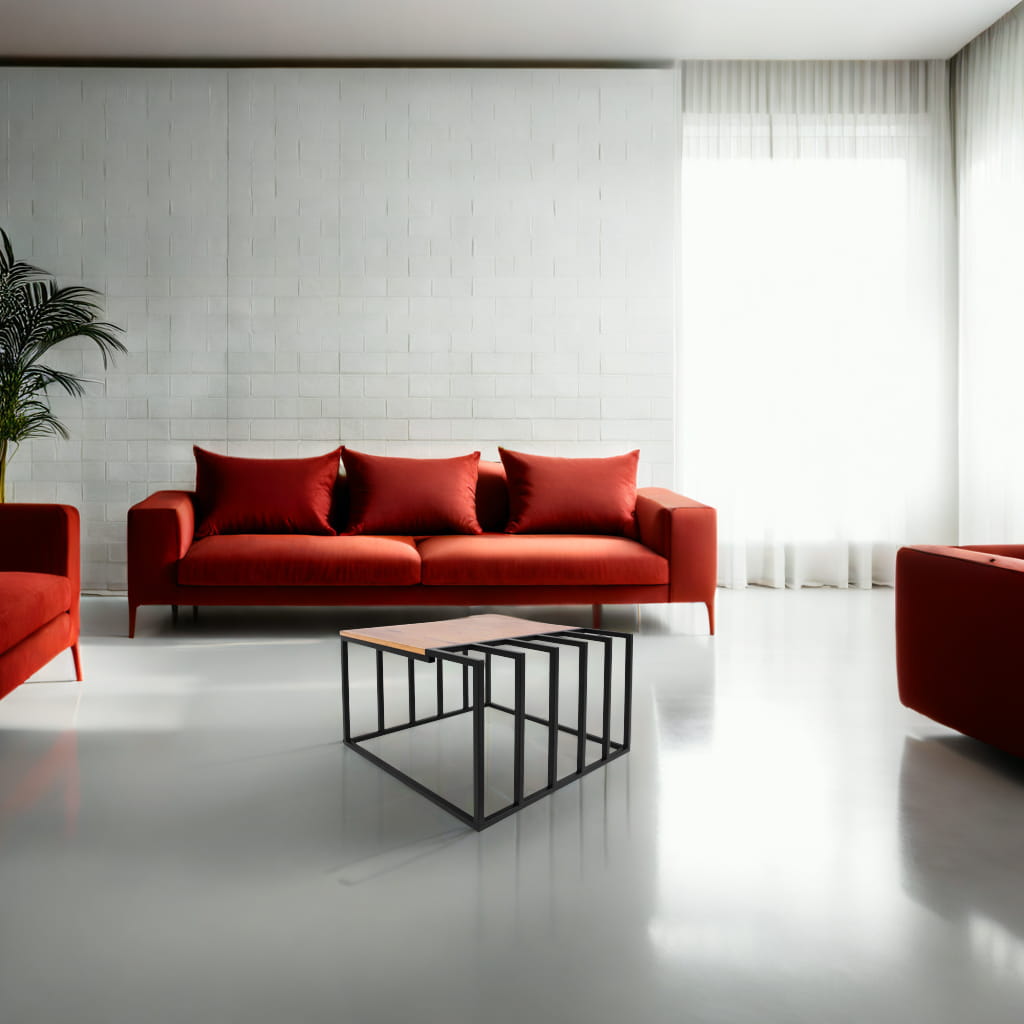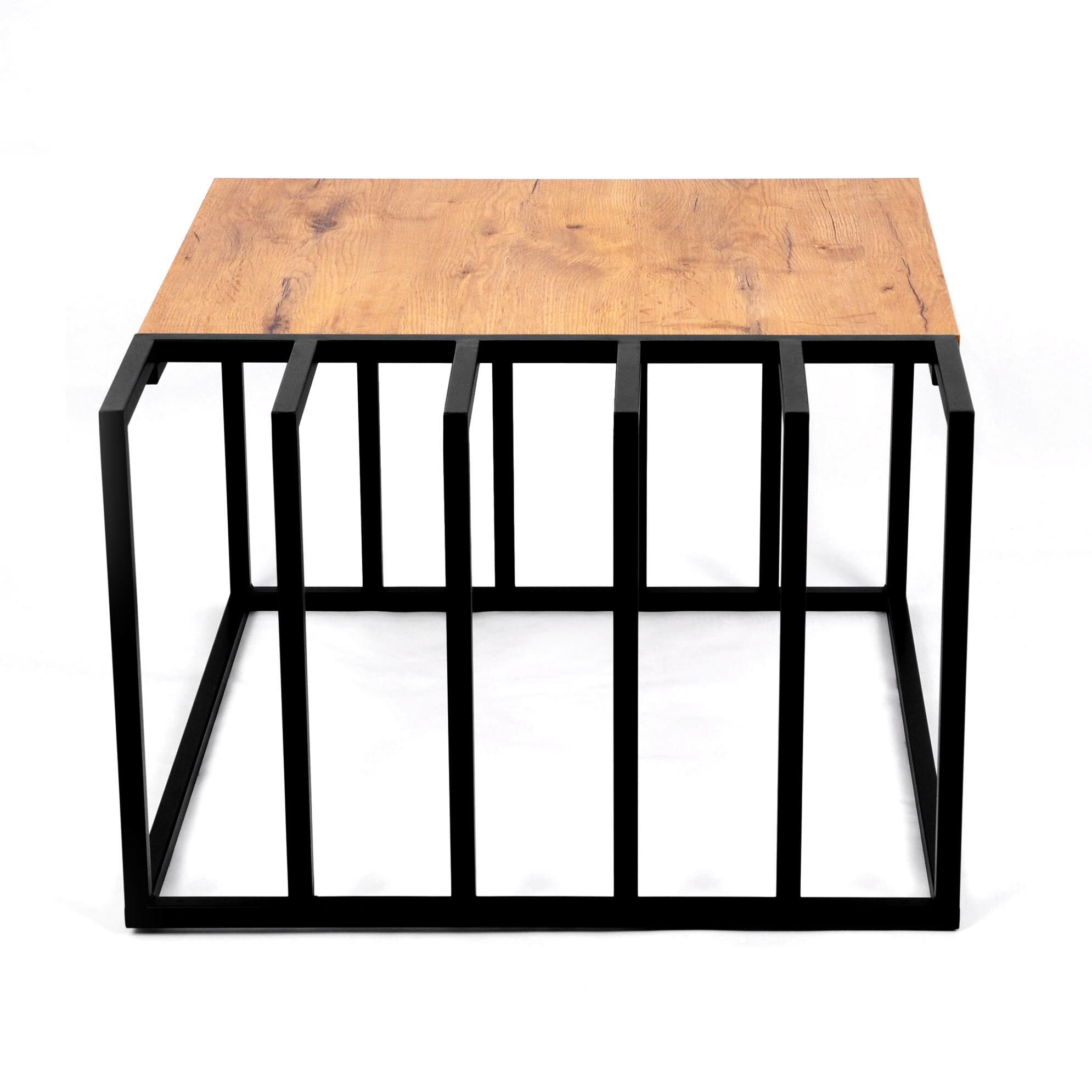 KS-27 to esencja trendu loft: surowy, czarny stelaż metalowy kontrastuje z naturalnym dekorem dębu, a lamele dodają bryle rytmu i przytulności. Prostokątny blat 70x50 cm pomieści tacę z napojami, piloty i ulubione dekoracje, zachowując porządek w strefie relaksu.