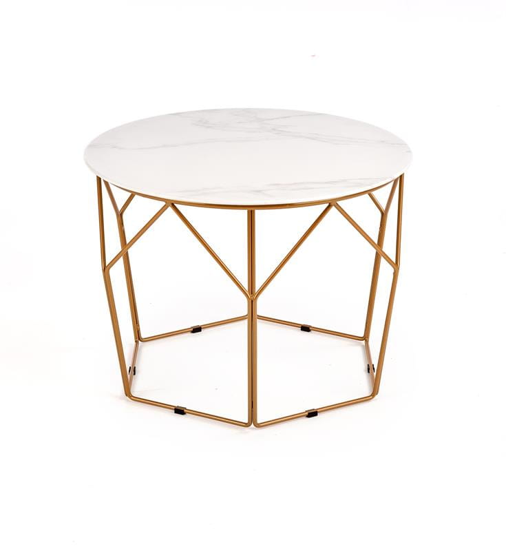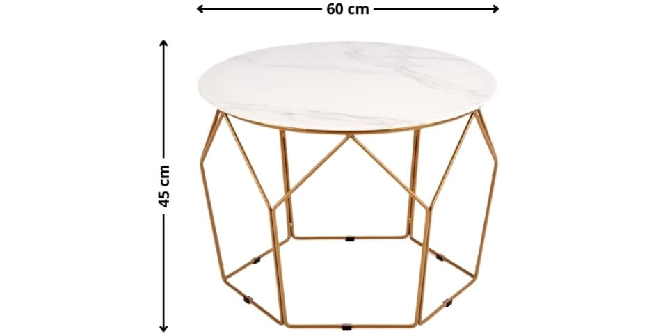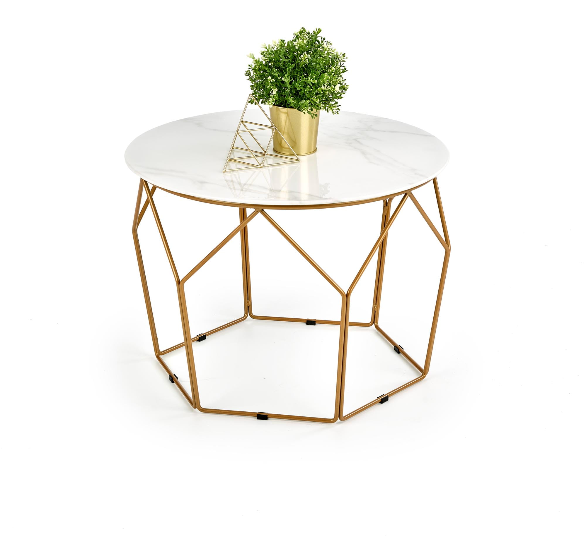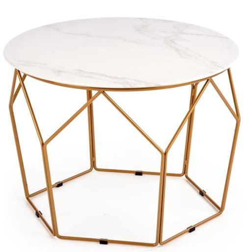 Stolik kawowy MADISON to propozycja dla osób, które poszukują połączenia nowoczesnej formy z ponadczasową elegancją. Okrągły blat imitujący biały marmur w zestawieniu ze złotym metalowym stelażem tworzy harmonijną całość, która natychmiast przyciąga wzrok i podkreśla prestiż wnętrza. Ten stolik kawowy do salonu doskonale sprawdzi się jako centralny punkt aranżacji, oferując zarówno estetykę, jak i codzienną funkcjonalność.