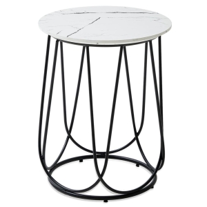 Stolik kawowy NUBIRA S biały marmur to kompaktowy, ale niezwykle efektowny mebel, który pięknie dopełni aranżację Twojego salonu, sypialni lub domowego biura. Okrągły blat z efektem białego marmuru osadzony na czarnym, metalowym stelażu tworzy eleganckie połączenie, które świetnie wpisuje się w aktualne trendy wnętrzarskie. Taki mały stolik kawowy idealnie sprawdzi się zarówno obok sofy, jak i przy fotelu do czytania, dodając wnętrzu lekkości i charakteru.