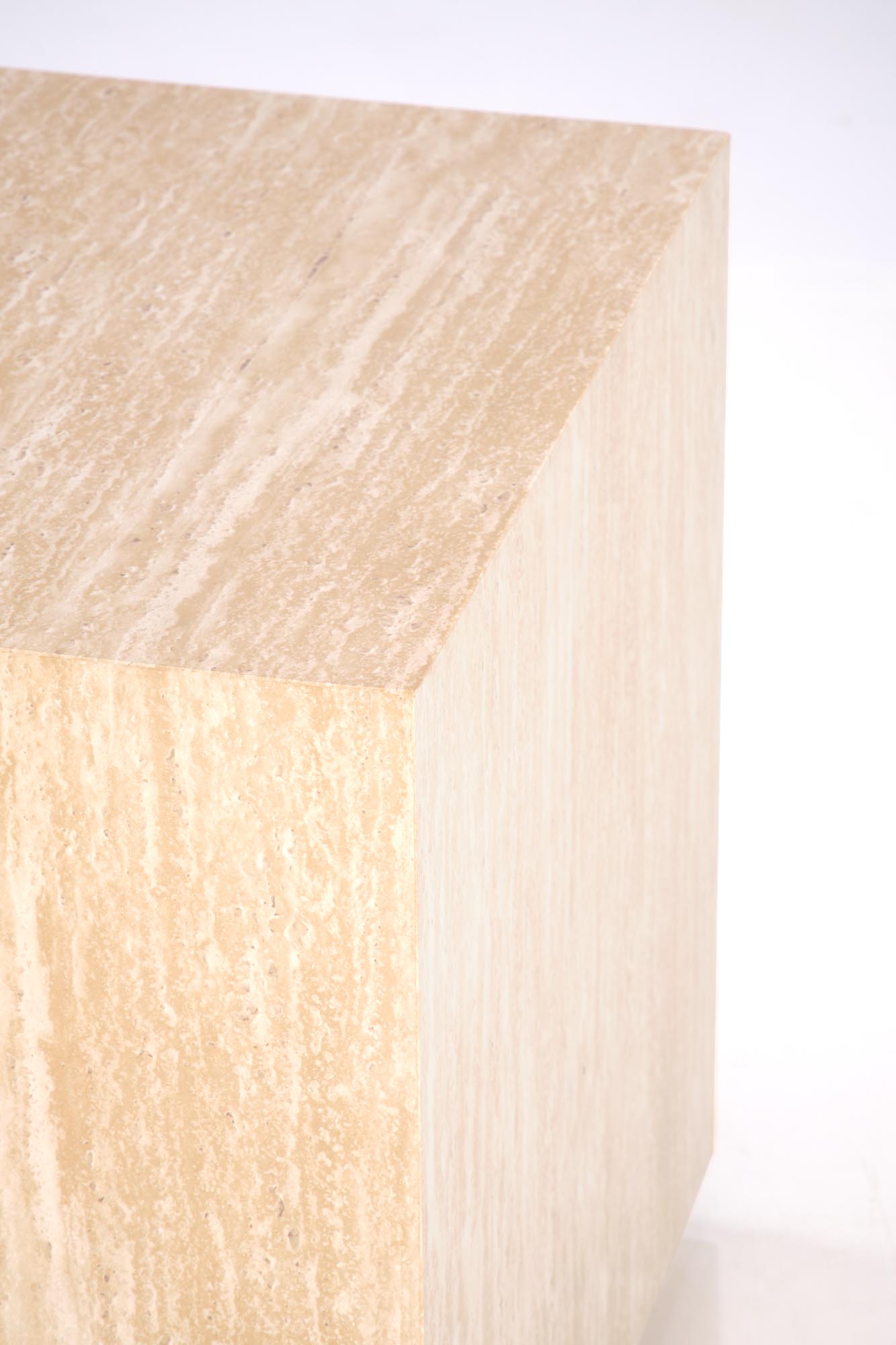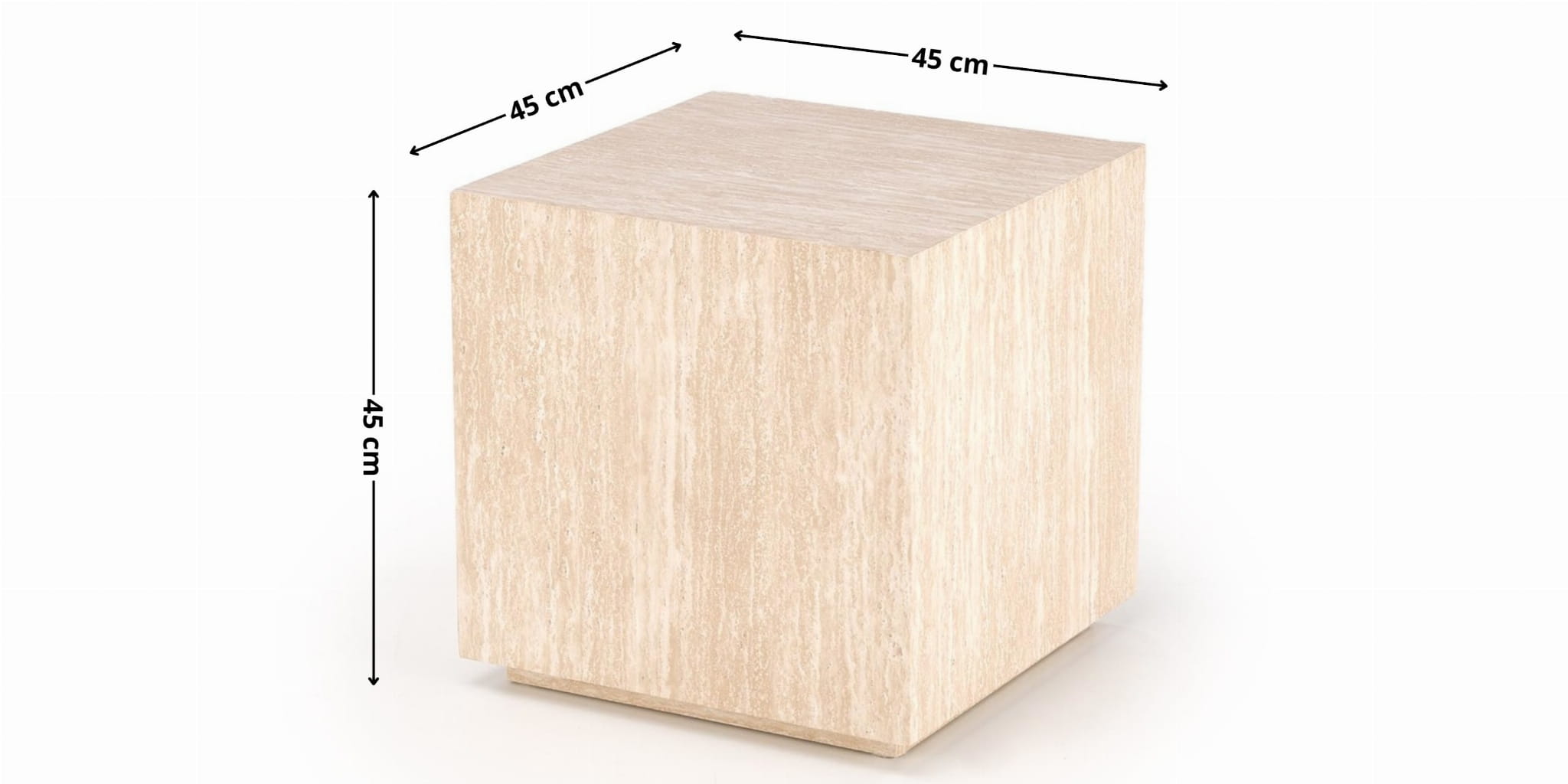 TRAVERTINO S to kompaktowy stolik kawowy 45x45 cm o wysokości 45 cm, łączący ponadczasowy efekt trawertynu z praktycznością MDF okleinowanego. Jako kwadratowy stolik pomocniczy do salonu świetnie sprawdzi się przy sofie, narożniku lub fotelu, a jego neutralna, beżowa kolorystyka harmonijnie współgra z drewnem, czernią i tkaninami.