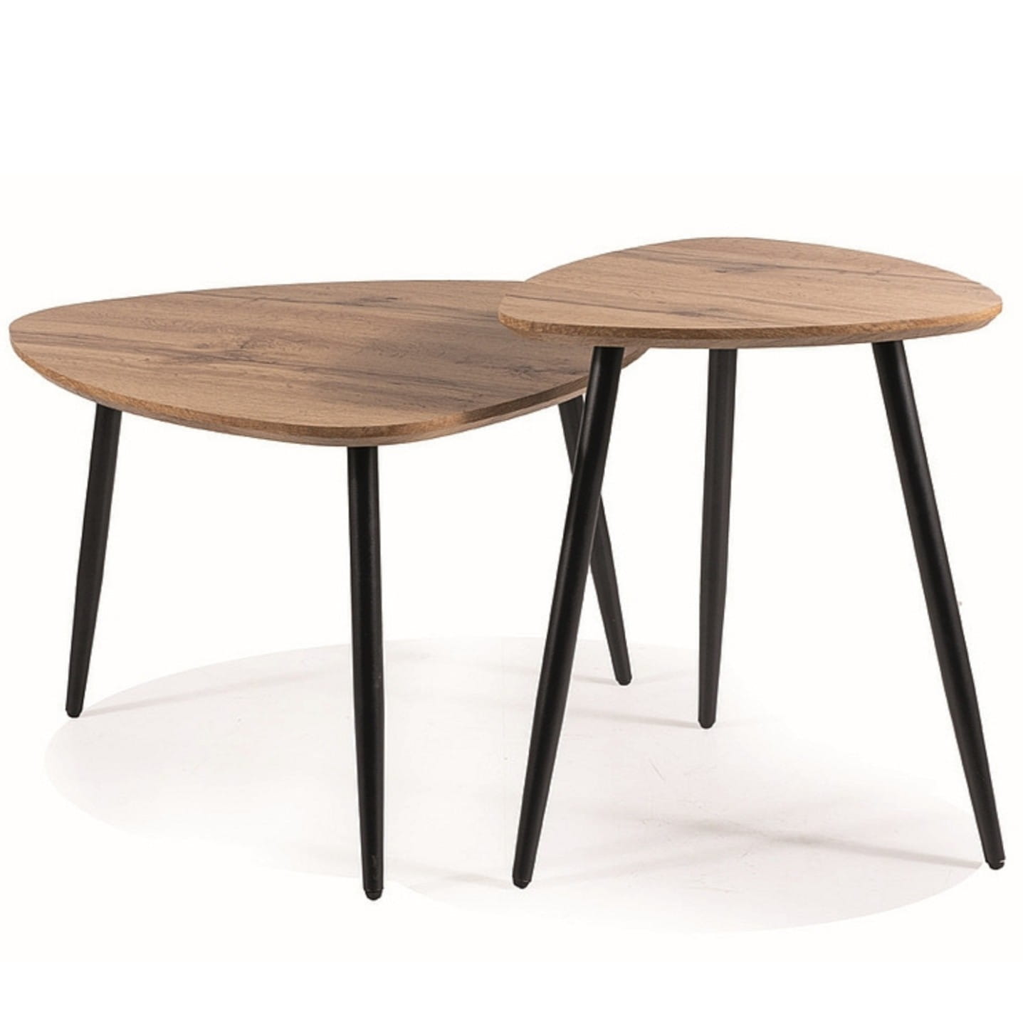 Zestaw stolików kawowych TWIN to połączenie nowoczesnego designu, funkcjonalności i ponadczasowej estetyki. Blaty w okleinie dąb artisan ocieplają wnętrze, a czarny, metalowy stelaż dodaje mu eleganckiej surowości. To idealny wybór dla osób, które cenią zarówno estetykę, jak i praktyczność. Zestaw 2 stolików o różnych rozmiarach umożliwia dowolne ustawienie – razem lub osobno, w zależności od potrzeb aranżacyjnych. Doskonale sprawdzą się jako nowoczesne stoliki pomocnicze do sofy, miejsca na dekoracje lub funkcjonalna przestrzeń do pracy z laptopem.