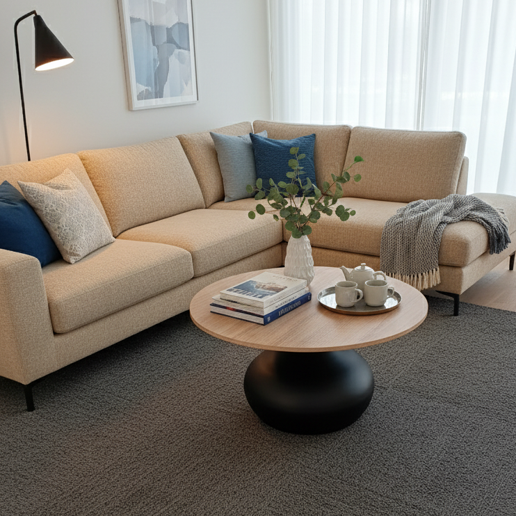 Dzięki wysokości 40 cm swobodnie odłożysz kubek, laptop czy książkę. Blat MDF z okleiną papierową jest prosty w pielęgnacji, a malowanie proszkowe podstawy zwiększa odporność na codzienne użytkowanie. To idealny wybór do wnętrz nowoczesnych, skandynawskich, japandi i loftowych – szczególnie, gdy zależy Ci na stoliku kawowym w kolorze dąb sonoma, który łatwo skomponujesz z innymi meblami.