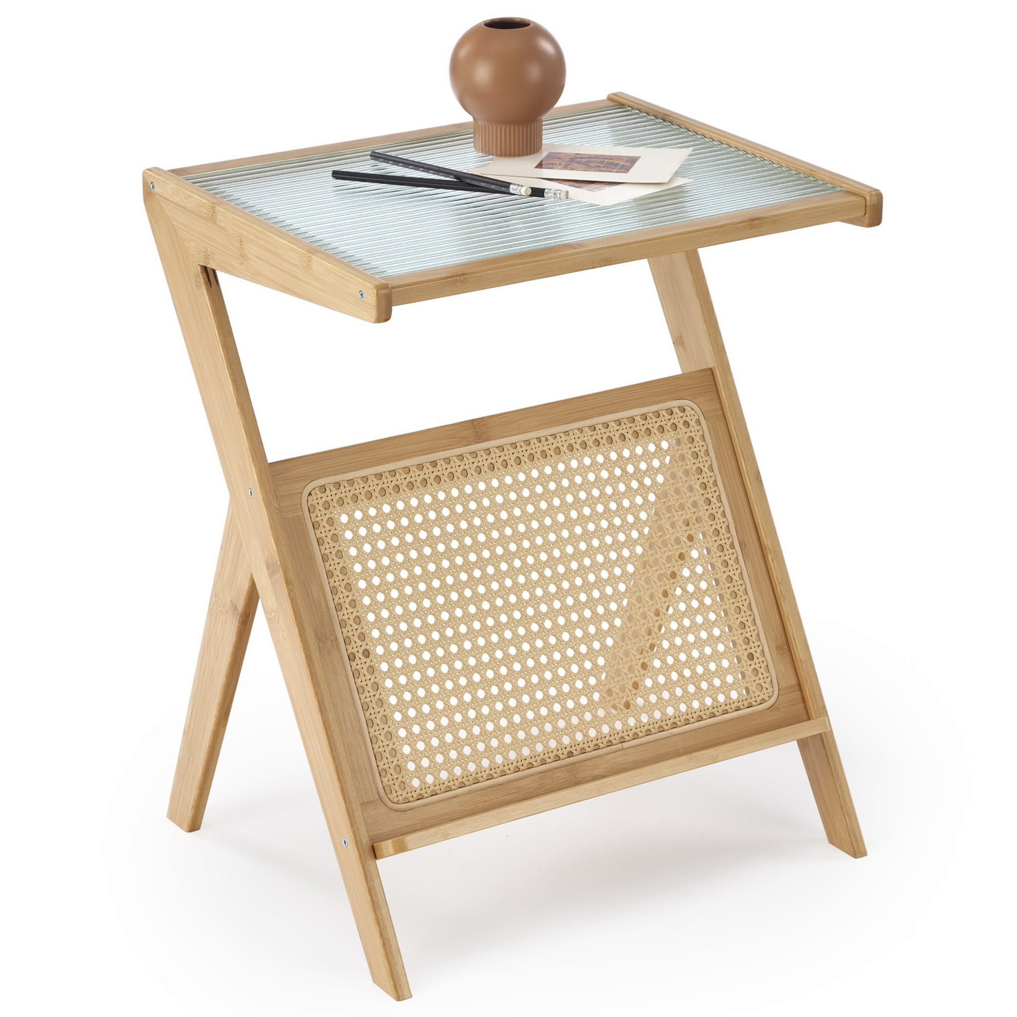 Stolik pomocniczy FLORA to połączenie funkcjonalności i naturalnego piękna. Wykonany z drewna bambusowego i rattanu, uzupełniony o szklany blat, wprowadza do wnętrza ciepło i lekkość. Jego jasnobrązowy odcień doskonale komponuje się z nowoczesnymi trendami aranżacyjnymi, tworząc atmosferę relaksu i harmonii. To mebel, który zachwyca prostotą i naturalnym charakterem, będąc jednocześnie praktycznym dodatkiem do codziennego użytkowania.