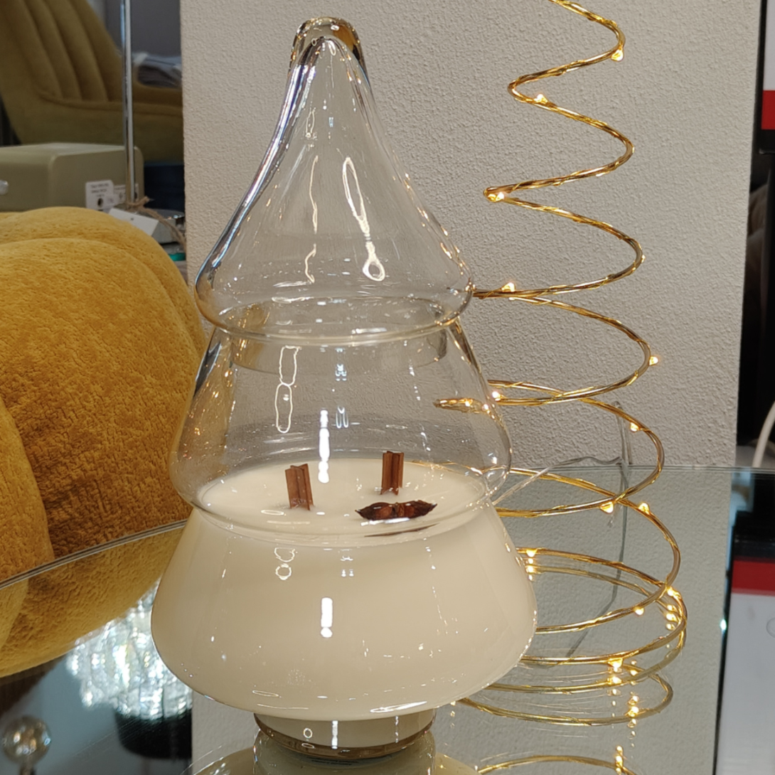 Duże, efektowne szkło w kształcie świątecznej choinki sprawia, że świeca staje się dekoracją samą w sobie – pięknie odbija światło, przyciąga wzrok i idealnie wpisuje się w świąteczne stylizacje wnętrz. To ozdoba, która wygląda luksusowo zarówno na stole wigilijnym, jak i na komodzie, kominku czy parapecie.