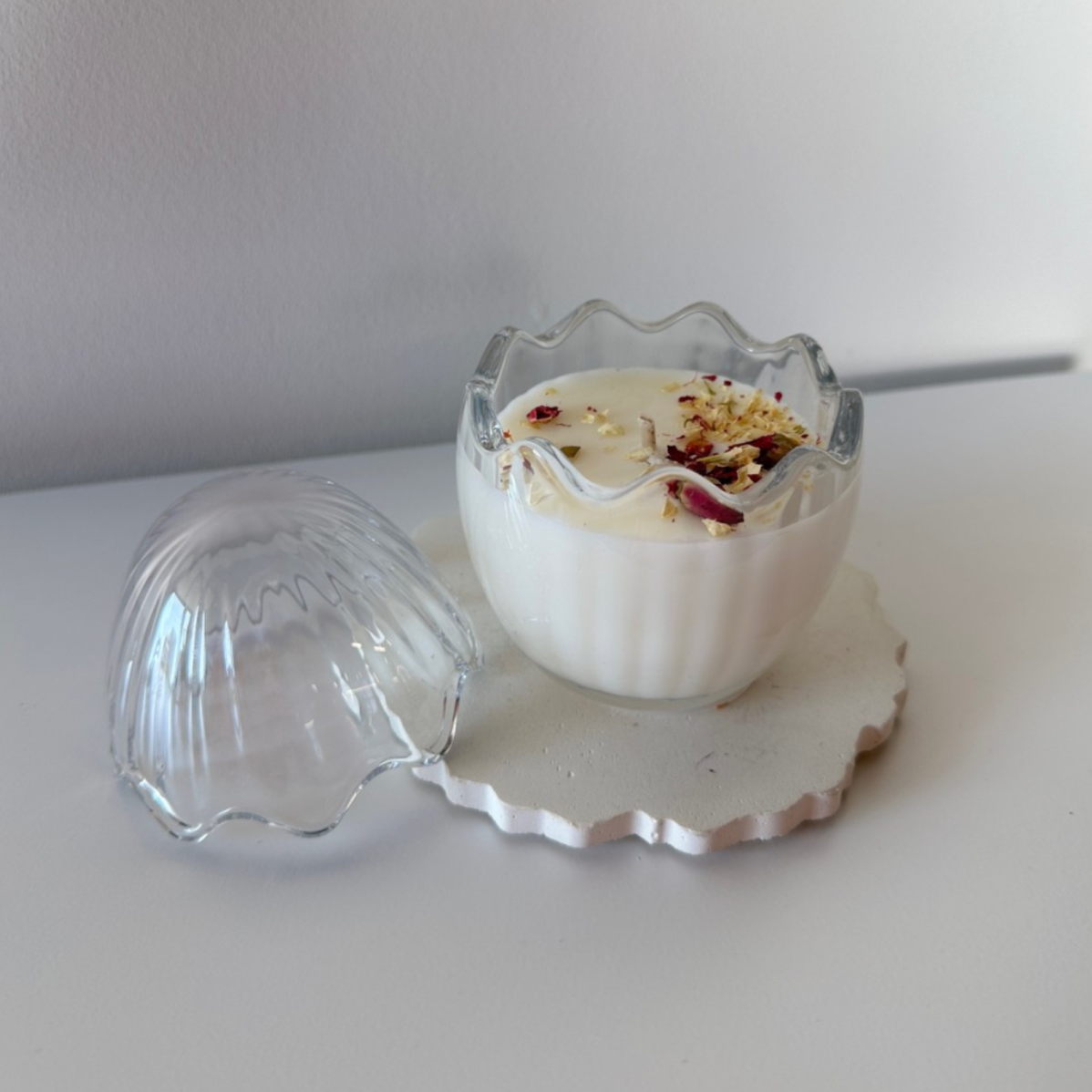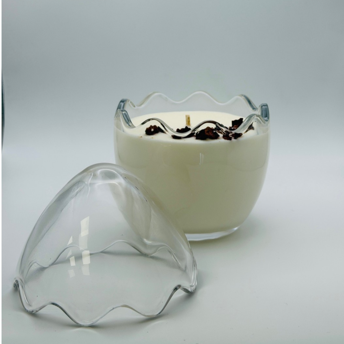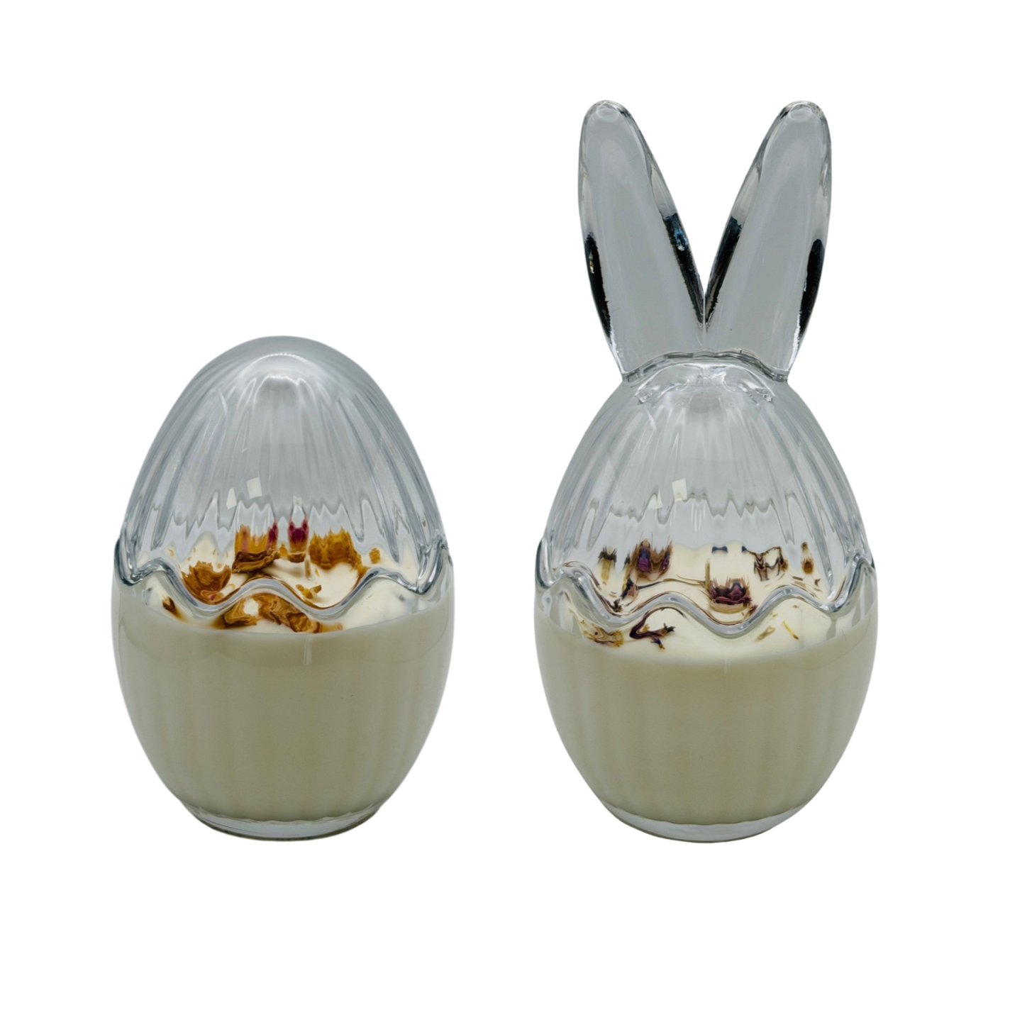 Transparentne ryflowane szkło subtelnie rozprasza światło płomienia, tworząc przytulną atmosferę w pomieszczeniu. Pokrywka w kształcie zajączkowych uszu przyciąga wzrok i nadaje świecy wyjątkowego uroku, dzięki czemu staje się ona stylową dekoracją wnętrza.