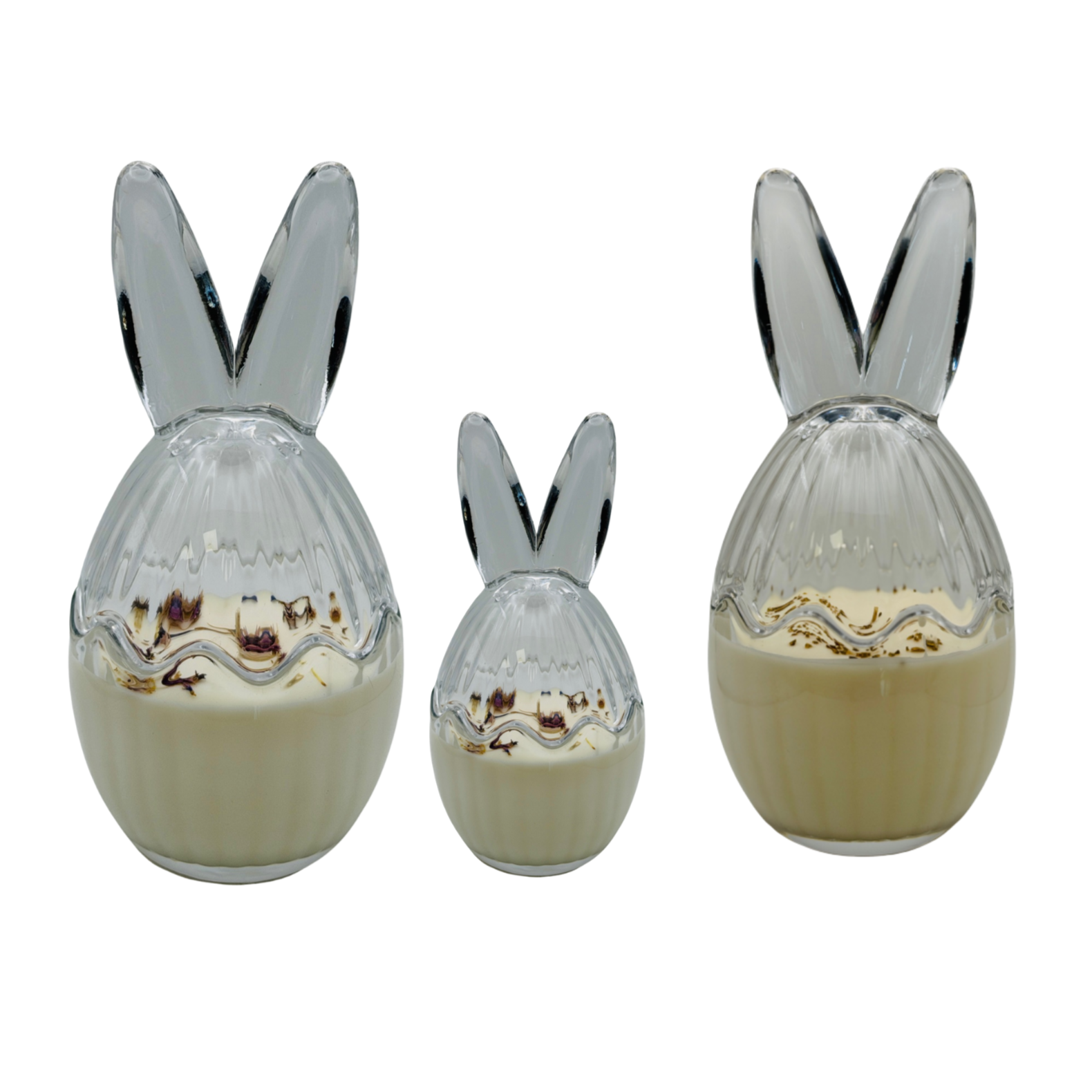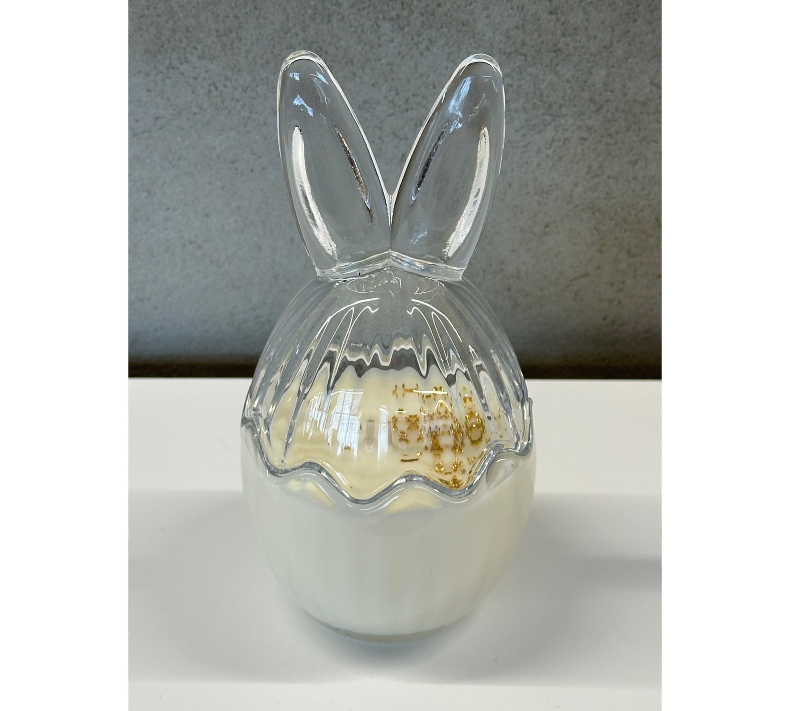 Transparentne ryflowane szkło subtelnie rozprasza światło płomienia, tworząc przytulną atmosferę w pomieszczeniu. Pokrywka w kształcie zajączkowych uszu nadaje świecy wyjątkowego charakteru i sprawia, że staje się ona piękną ozdobą stołu lub półki.