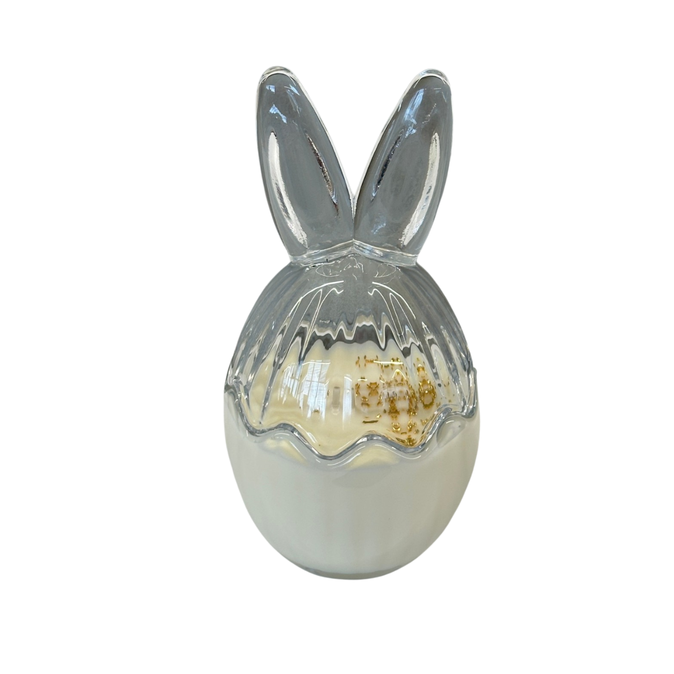 Transparentne ryflowane szkło subtelnie rozprasza światło płomienia, tworząc przytulną atmosferę w pomieszczeniu. Charakterystyczna pokrywka w kształcie zajączkowych uszu nadaje świecy wyjątkowego uroku, dzięki czemu staje się nie tylko źródłem zapachu, ale również stylową dekoracją wnętrza.