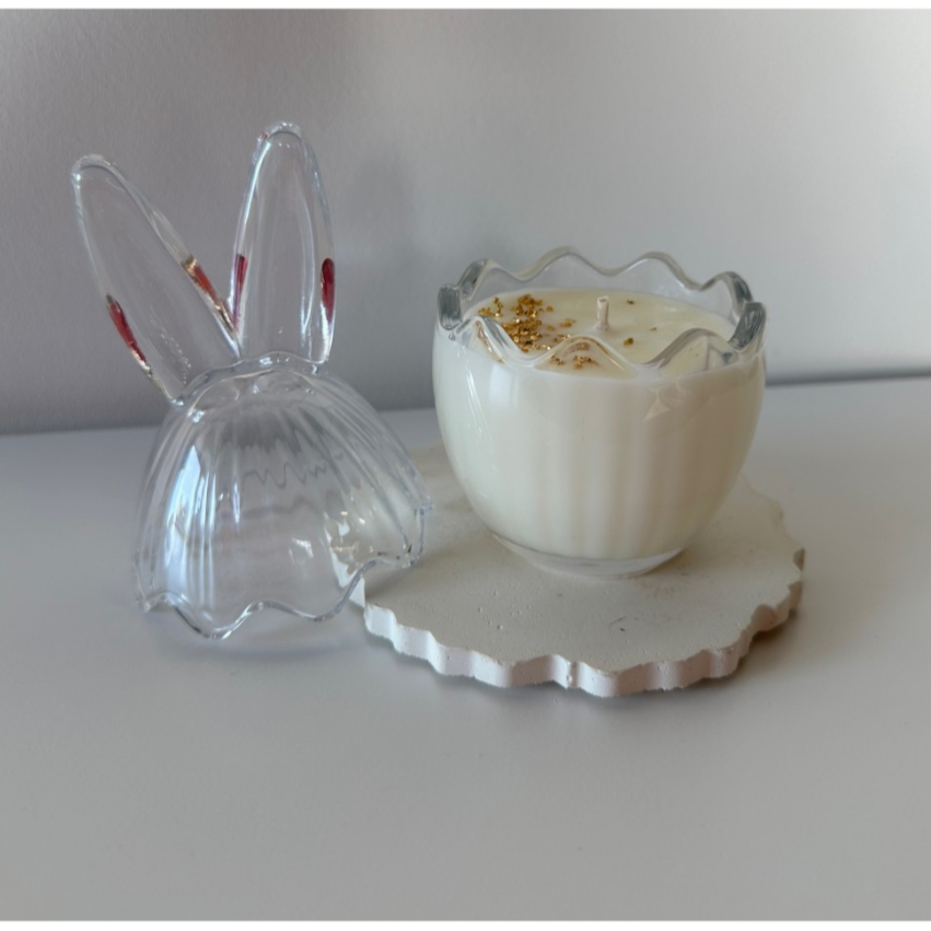 Świeca Mały Zając dzięki dekoracyjnemu ryflowanemu szkłu i pokrywce w kształcie zajączkowych uszu staje się nie tylko źródłem pięknego aromatu, ale również stylową ozdobą wnętrza.