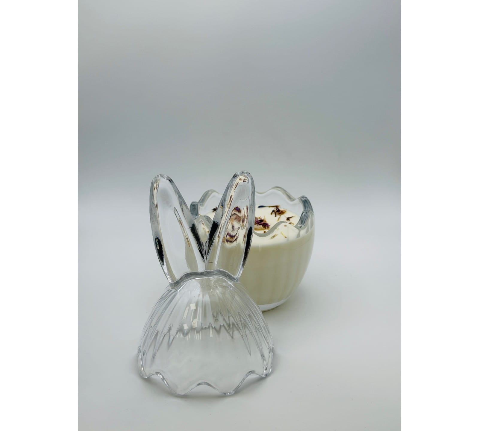 Transparentne ryflowane szkło subtelnie rozprasza światło płomienia, tworząc przytulną atmosferę w pomieszczeniu. Charakterystyczna pokrywka w kształcie zajączkowych uszu przyciąga wzrok i sprawia, że świeca staje się stylową dekoracją domu.