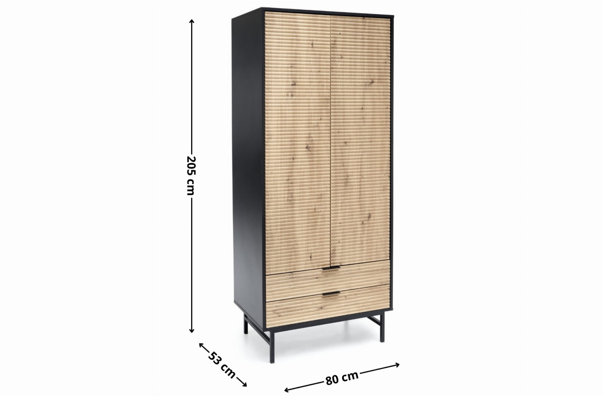 To idealny wybór, jeśli szukasz szafy loftowej z szufladami, która nie tylko przechowa garderobę, ale także stanie się wyrazistym elementem aranżacji. Szafa na ubrania 80 cm szerokości świetnie wpasuje się w mniejsze i średnie pomieszczenia, gwarantując kompromis między pojemnością a oszczędnością miejsca. Dzięki uniwersalnej kolorystyce dąb artisan + czarny, dopasujesz ją do komód, łóżek i stolików nocnych w podobnym stylu.