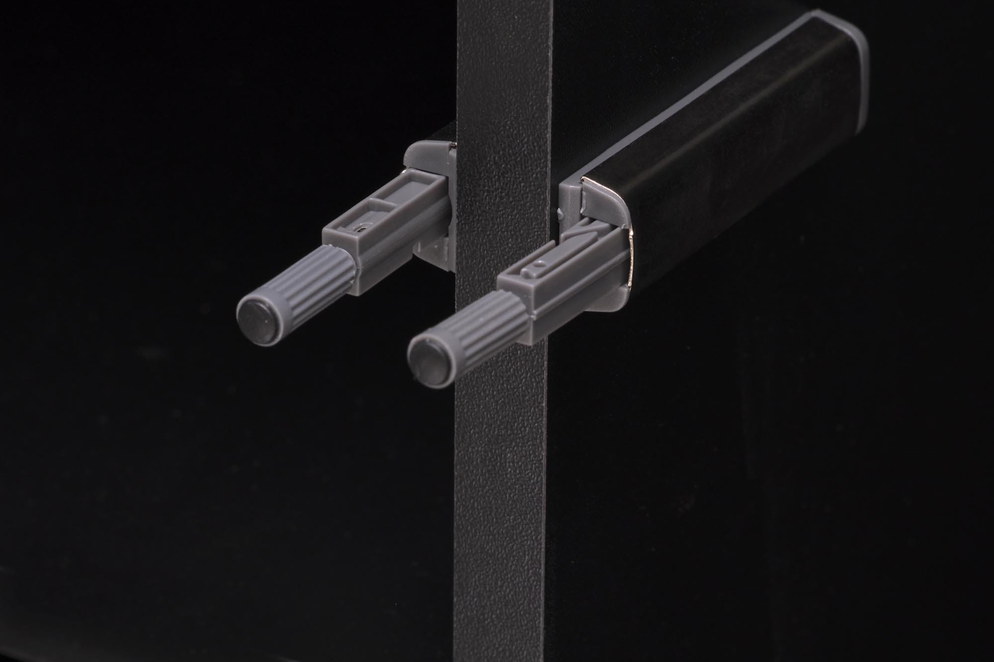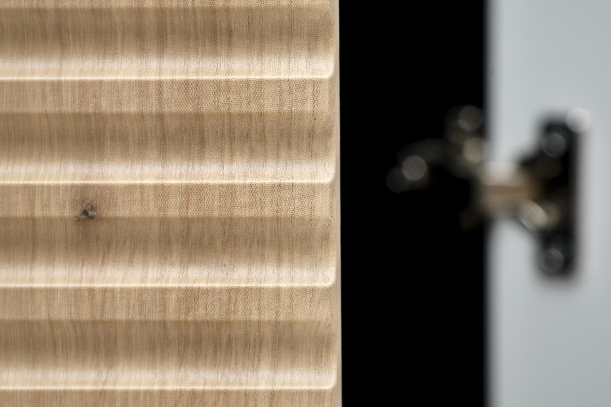 - Pionowe żłobienia na frontach – nadają bryle lekkości i tworzą nowoczesny, efektowny rysunek na drzwiach szafy