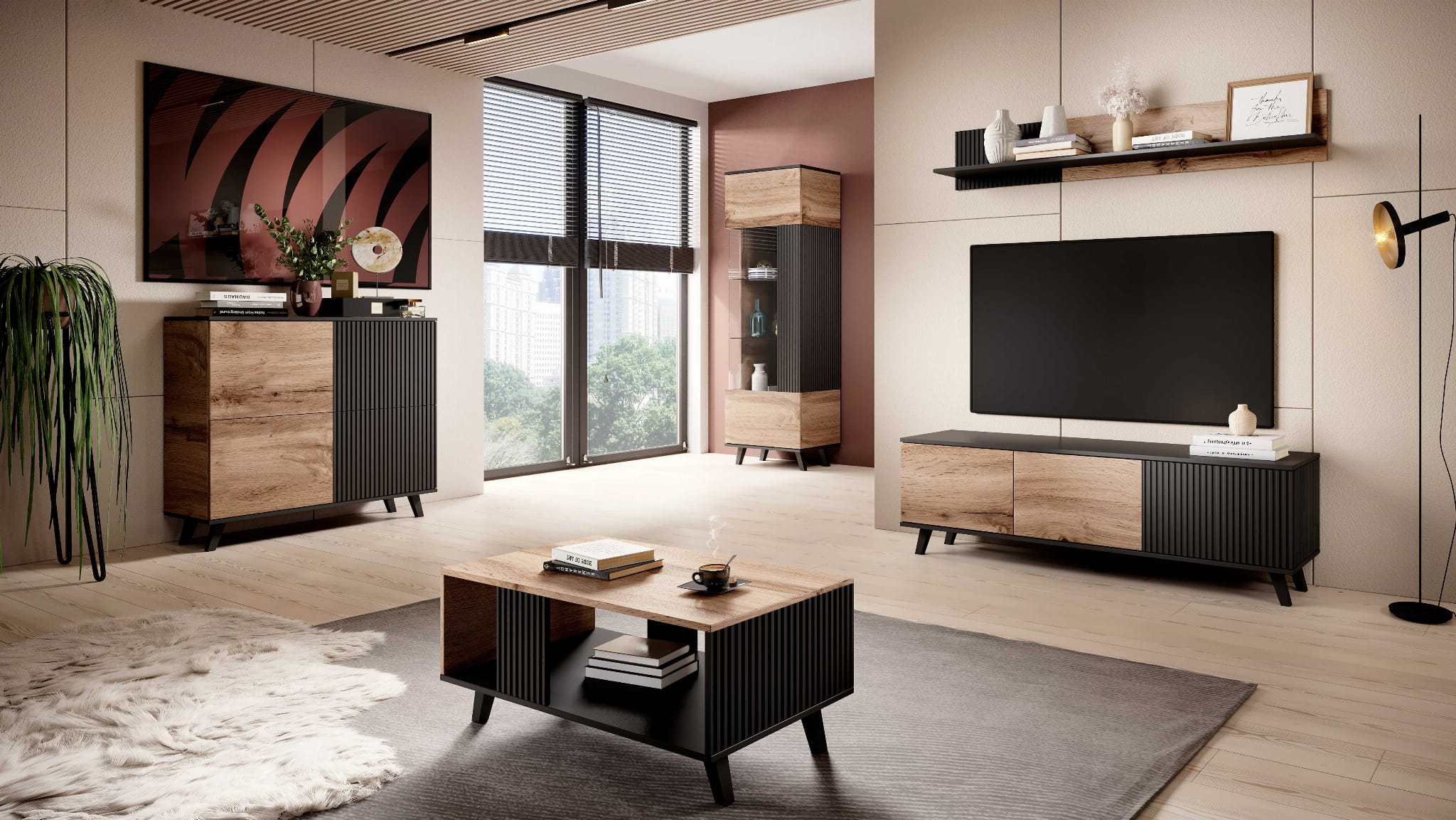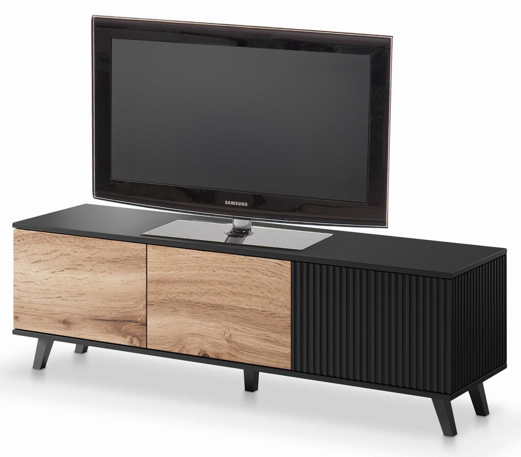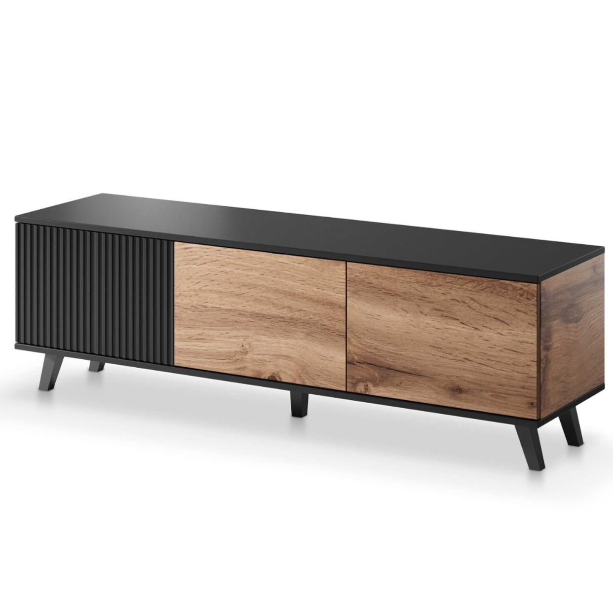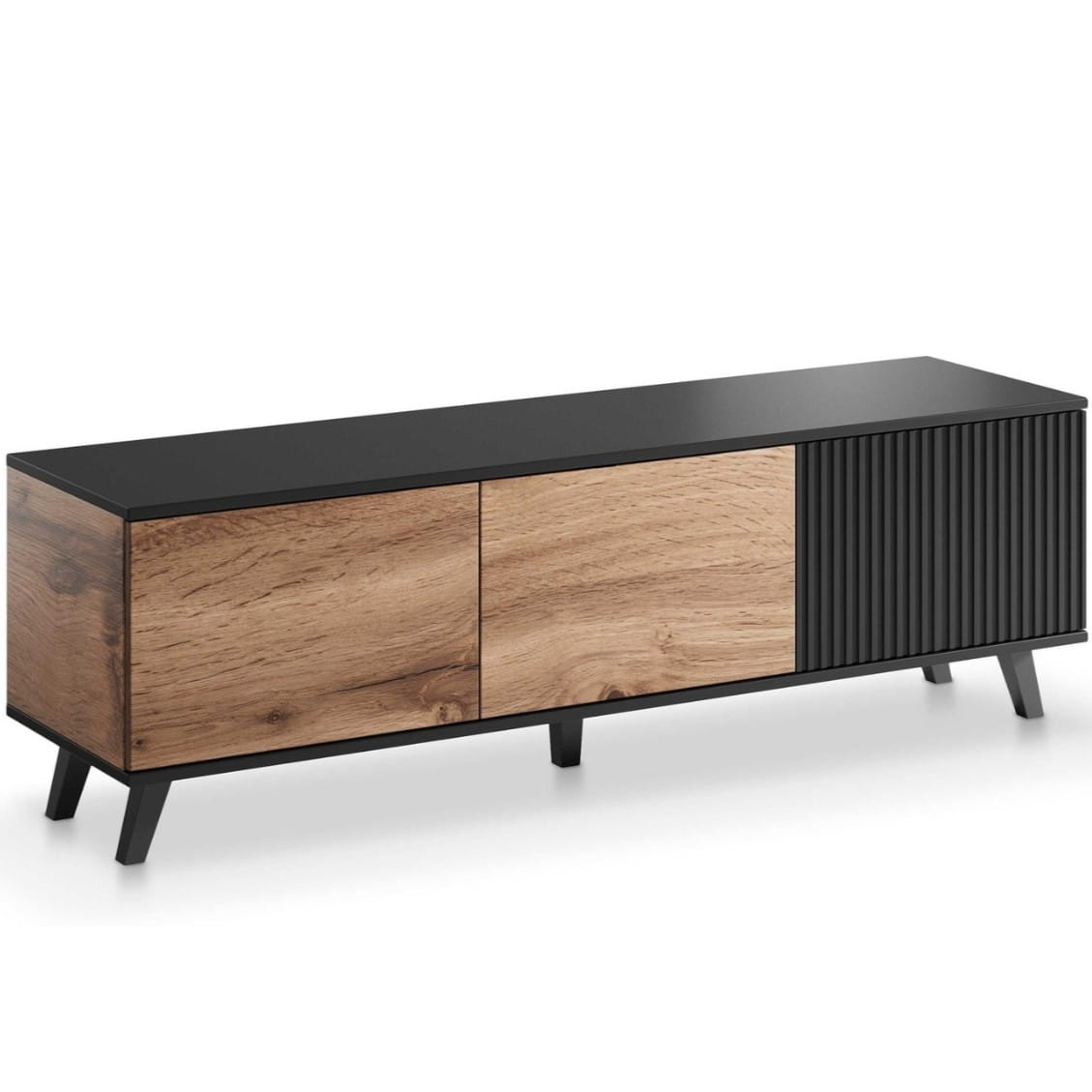 Połączenie ryflowanych czarnych frontów z naturalnym dekorem dąb wotan tworzy elegancki kontrast, który przyciąga wzrok i dodaje wnętrzu charakteru. Taki design doskonale wpisuje się w modne aranżacje typu nowoczesny salon, styl loftowy czy minimalistyczne wnętrza. Mebel wygląda lekko dzięki smukłym nogom, a jednocześnie zachowuje solidną i stabilną konstrukcję.