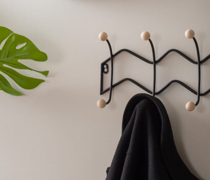 Ten wieszak na ścianę z metalu zachwyca nie tylko wyglądem, ale i praktycznością. Pozwoli Ci utrzymać porządek, wyeksponować ulubione dodatki lub wygodnie odwiesić codzienną garderobę. Czarny kolor i geometryczny kształt nadają mu eleganckiego charakteru, który podkreśli indywidualny styl Twojego wnętrza.
