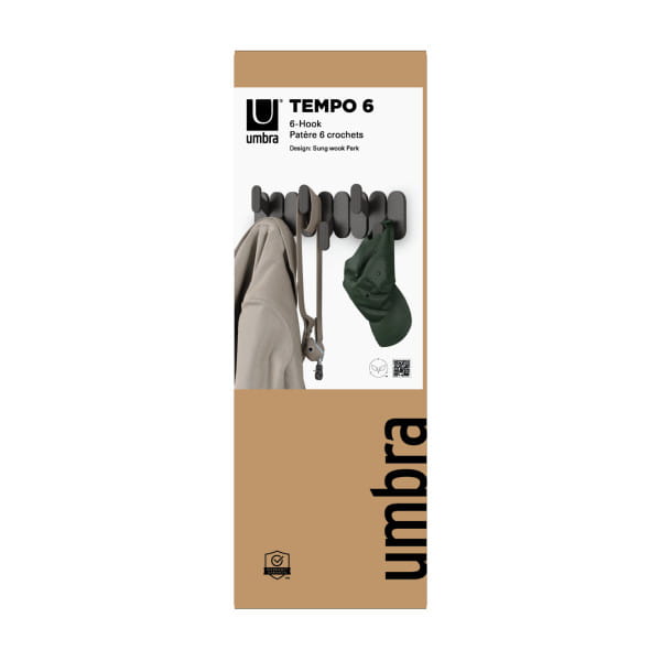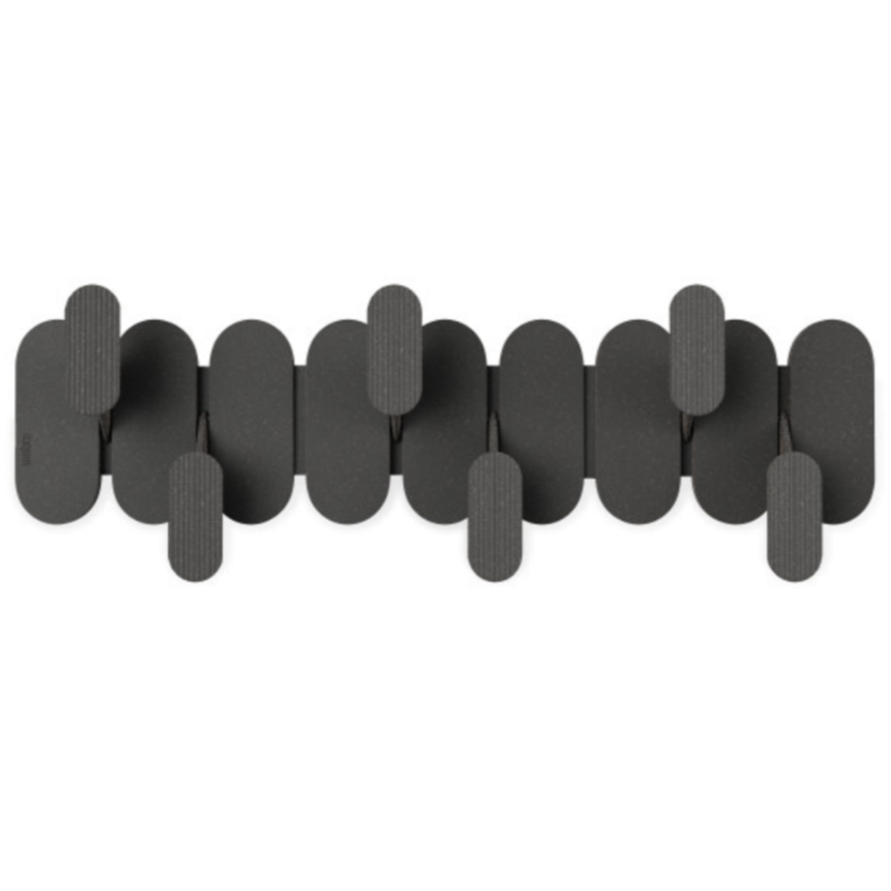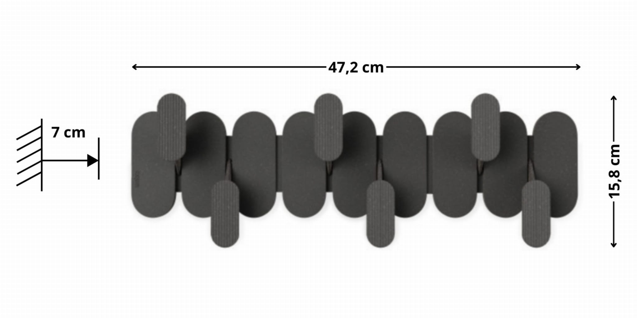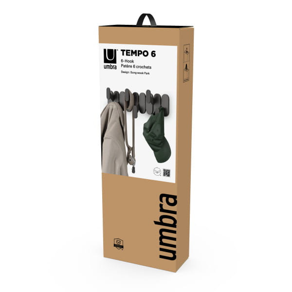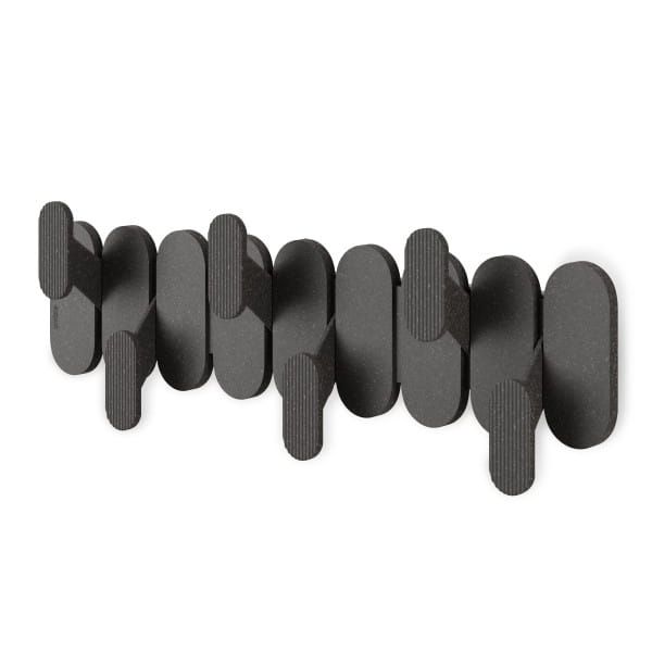 Wieszak ścienny TEMPO 6 Hook to połączenie codziennej funkcjonalności i nowoczesnego stylu. Sześć rozmieszczonych naprzemiennie haczyków tworzy efektowną, graficzną formę na ścianie, a przy tym pomaga zachować porządek w każdej przestrzeni. Został wykonany z tworzywa pochodzącego z recyklingu i włókna drzewnego, co nadaje mu lekkości, trwałości oraz naturalnej, subtelnej tekstury.