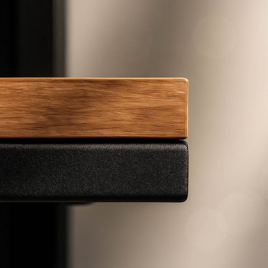 - Nowoczesny design – połączenie czarnego metalu i płyty w kolorze dębu
