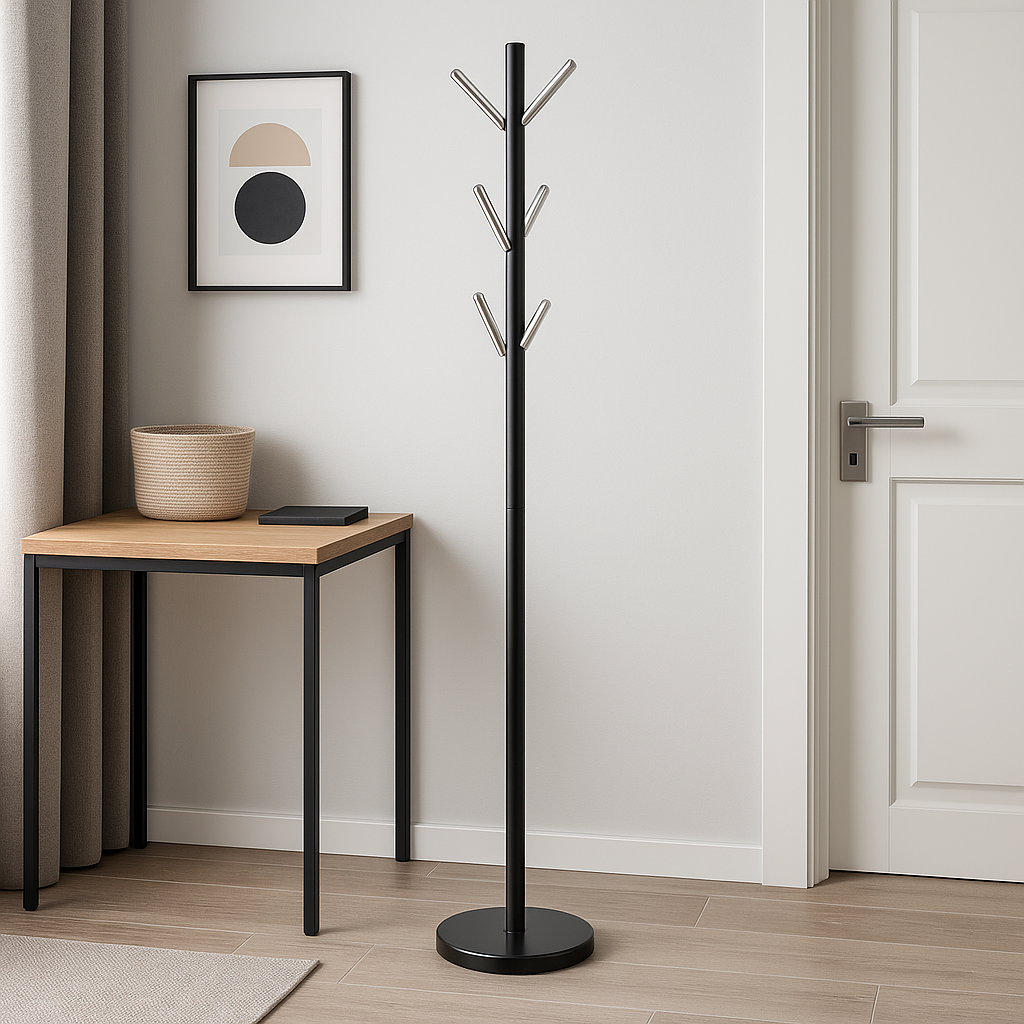 ✨ Nowoczesny wieszak stojący ALLEN czarny chrom – elegancki organizer do przedpokoju i biura