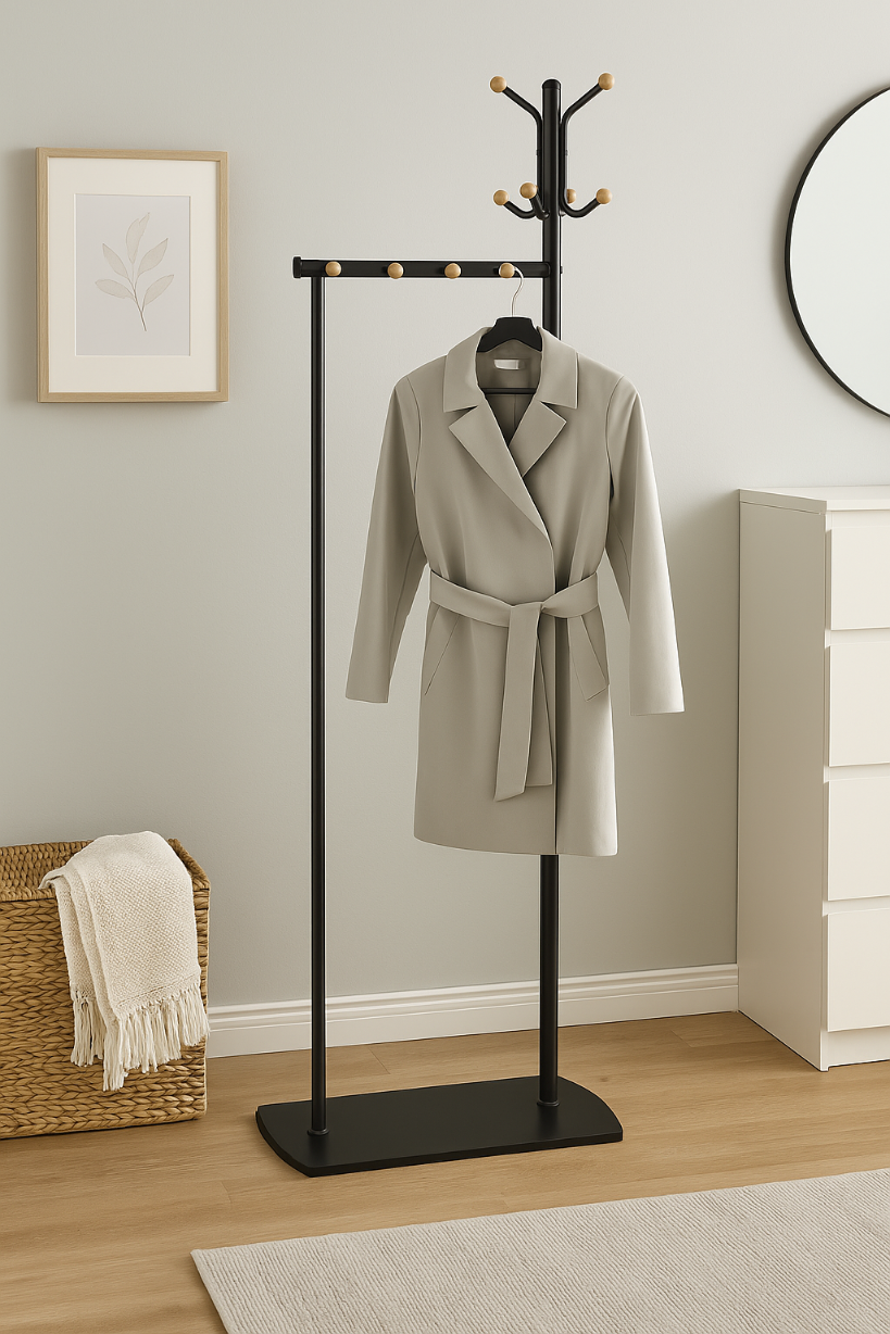 ✨ SIMON – funkcjonalny wieszak stojący z metalu i drewna bukowego