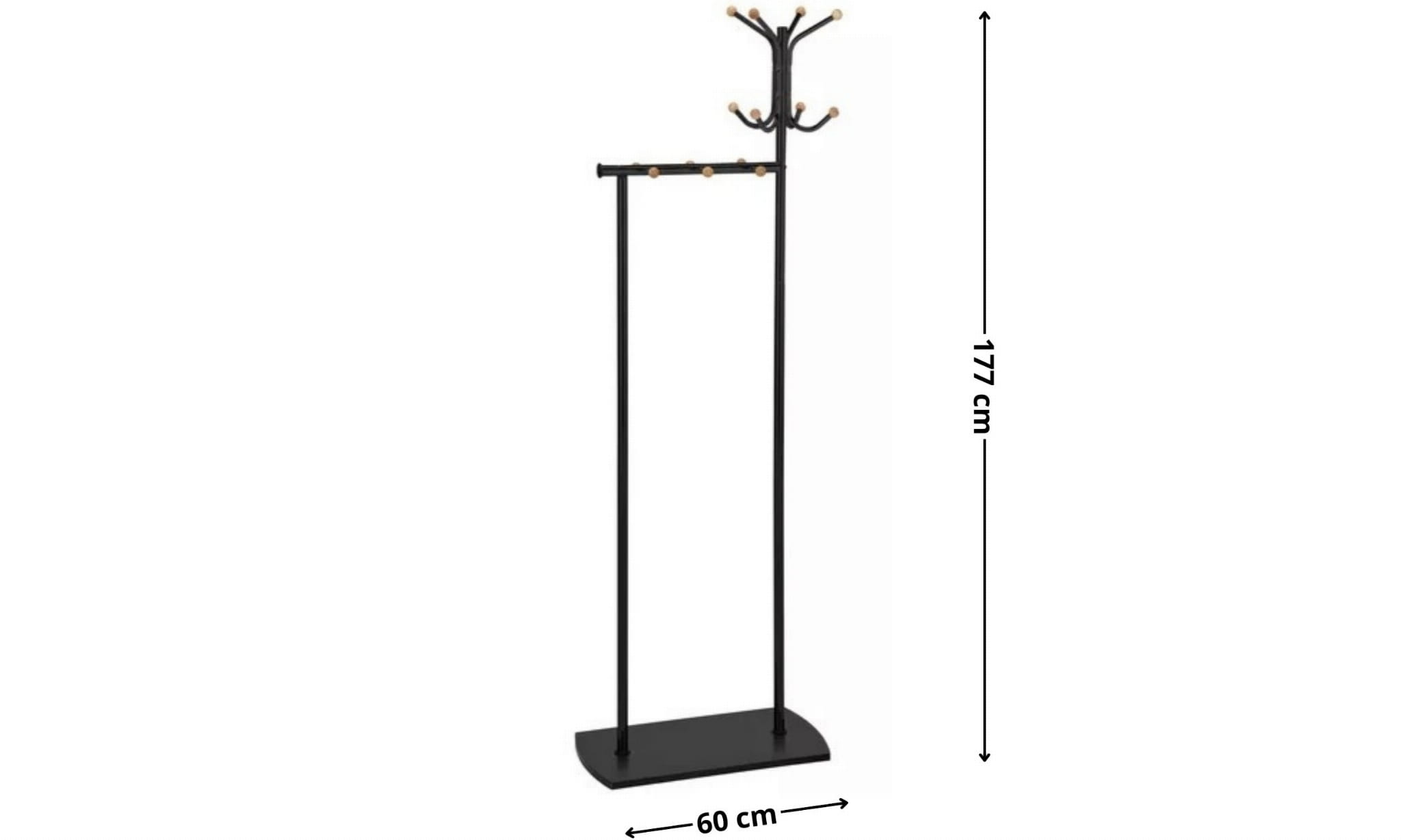 Stabilna podstawa o wymiarach 30 × 60 cm oraz wysokość 177 cm sprawiają, że to praktyczny i wyjątkowo wygodny wieszak na ubrania do przedpokoju. Jest doskonały zarówno do domów, jak i przestrzeni komercyjnych – biur, recepcji czy gabinetów.