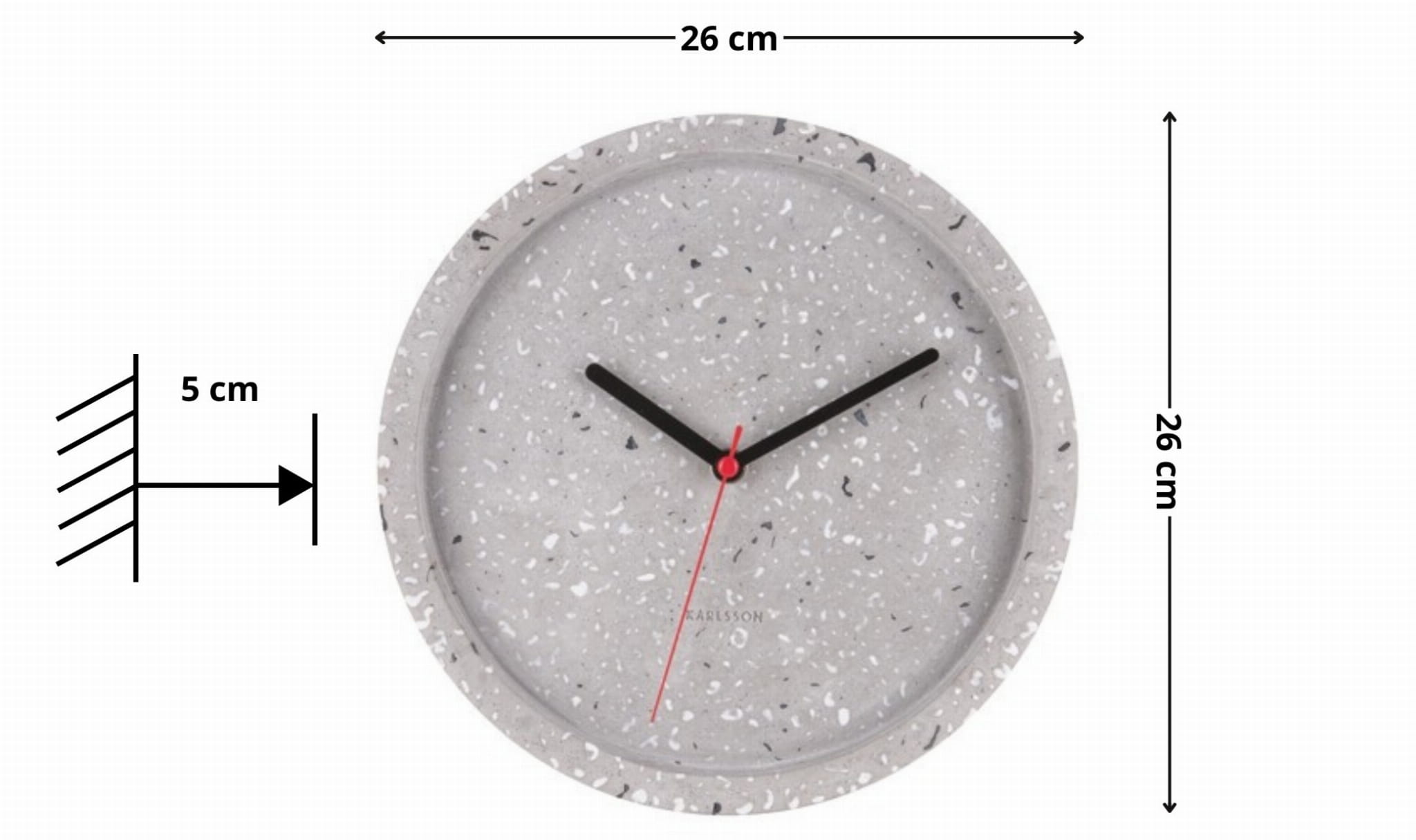 Szary zegar ścienny terrazzo TOM TERRAZZO to kompaktowa średnica 26 cm i eleganckie lastryko, które wprowadza modny, a zarazem ponadczasowy charakter do Twojego wnętrza. To idealny zegar do salonu, kuchni czy biura – łączy nowoczesny design z funkcjonalnością, tworząc wyrafinowany punkt orientacyjny na ścianie.