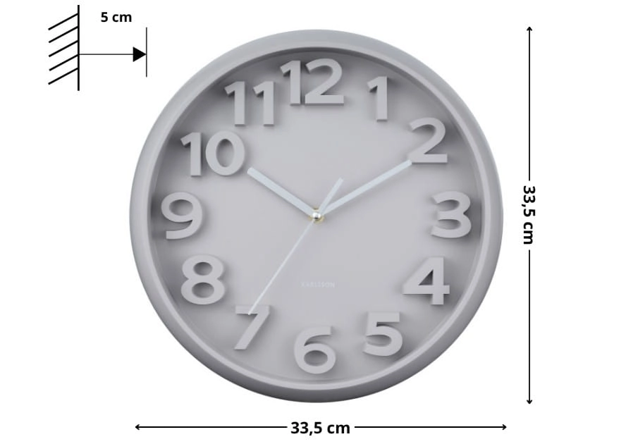 - Średnica 33,5 cm – daje dobrą równowagę między funkcjonalnością a dekoracyjnością, dzięki czemu zegar nie ginie na ścianie, ale też jej nie przytłacza.