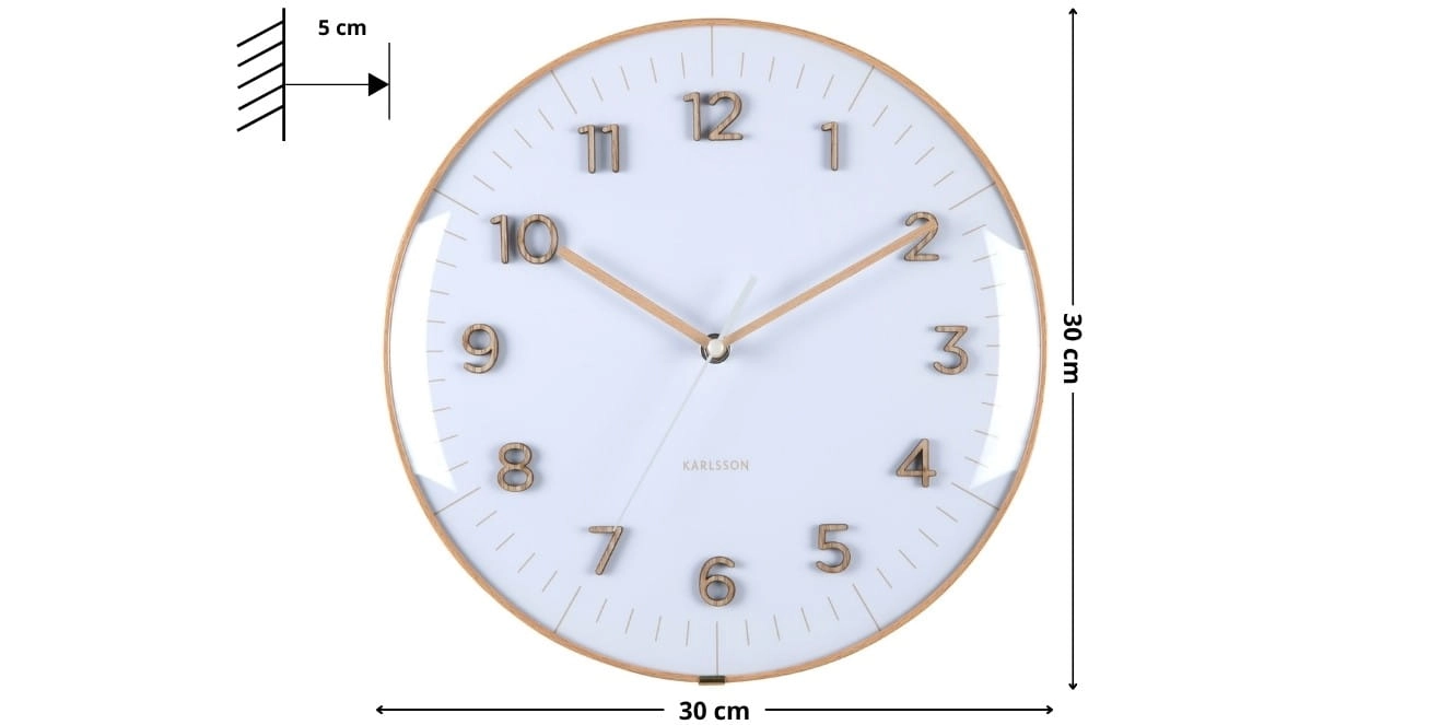 ESENCIA DOME to zegar ścienny biały, który łączy czytelną tarczę, spokojną kolorystykę i wypukły front typu dome. Dzięki średnicy 30 cm dobrze sprawdzi się jako zegar do salonu, kuchni, sypialni albo biura domowego, gdzie liczy się zarówno funkcja, jak i estetyczny porządek na ścianie.