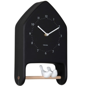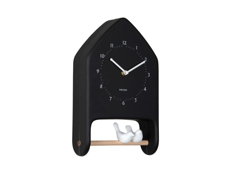 W kuchni pomaga kontrolować czas podczas porannego wyjścia, w przedpokoju przypomina o godzinie przed spotkaniem, a w salonie działa jak kontrastowy akcent do wnętrza. Czarna forma domku dobrze odcina się od jasnego tła, a białe ptaszki i drewniana żerdka łagodzą całość, dzięki czemu model nie wygląda zbyt ciężko.