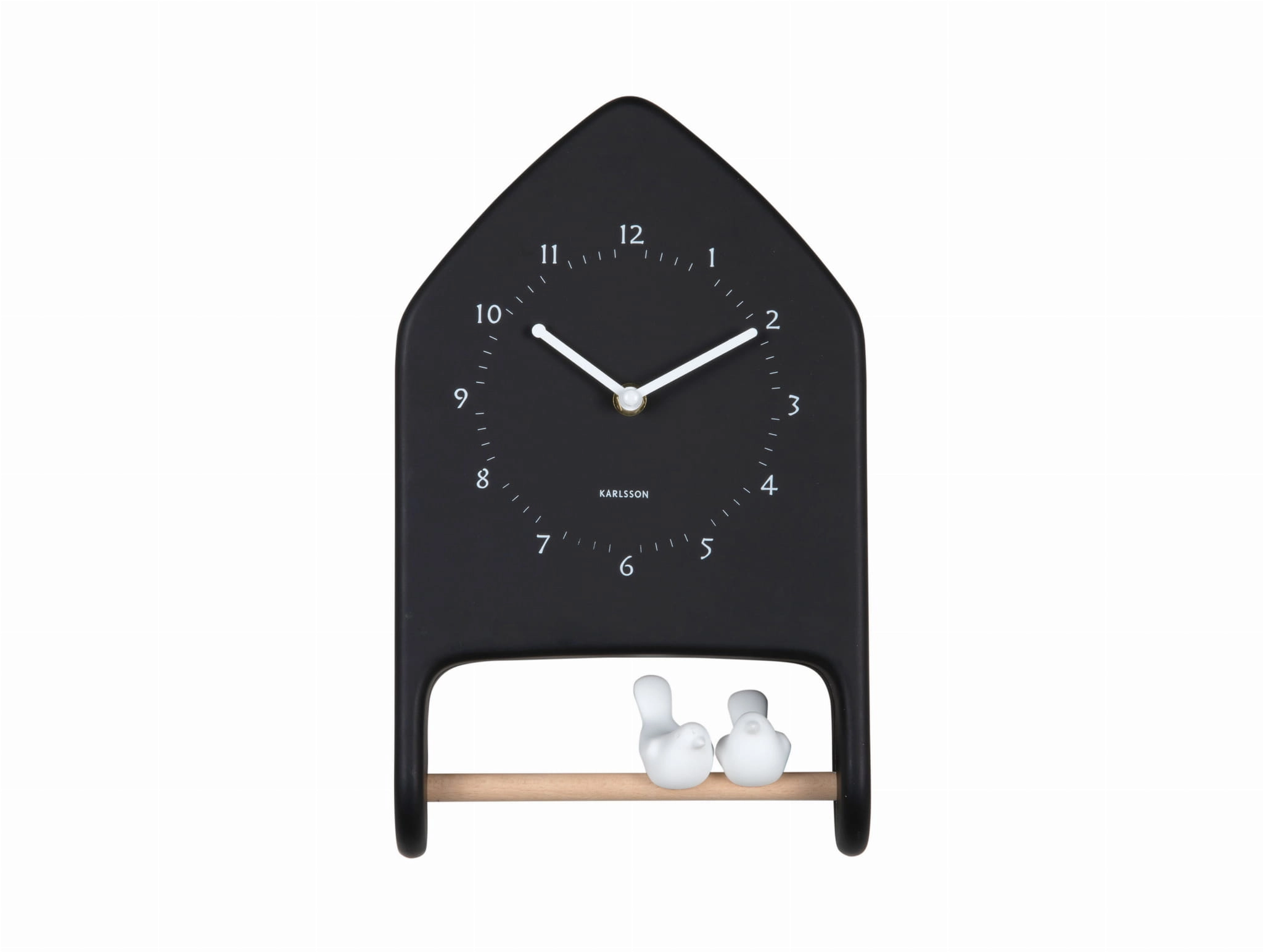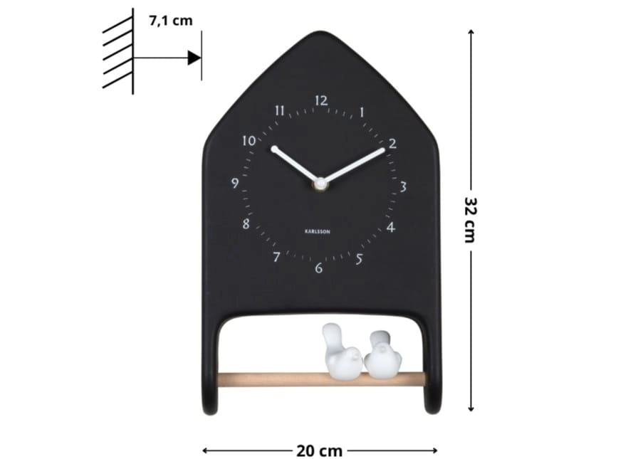 LOVE BIRDS to czarny zegar ścienny z ptaszkami, który łączy praktyczne odmierzanie czasu z dekoracyjnym charakterem. Forma małego domku, kontrastowe wskazówki i dwa białe ptaszki na drewnianej żerdce sprawiają, że model działa nie tylko jako zegar wskazówkowy na ścianę, ale też jako wyrazista dekoracja ścienna do salonu, kuchni lub przedpokoju.