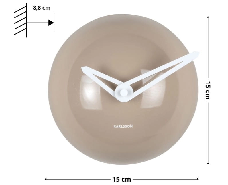 Średnica 15 cm sprawia, że ten mały zegar ścienny sprawdzi się także w wąskich przestrzeniach, nad półką, przy ekspresie do kawy, obok biurka lub w przedpokoju. Minimalistyczna tarcza bez cyfr i jasne wskazówki podkreślają jego lekki, nowoczesny charakter.
