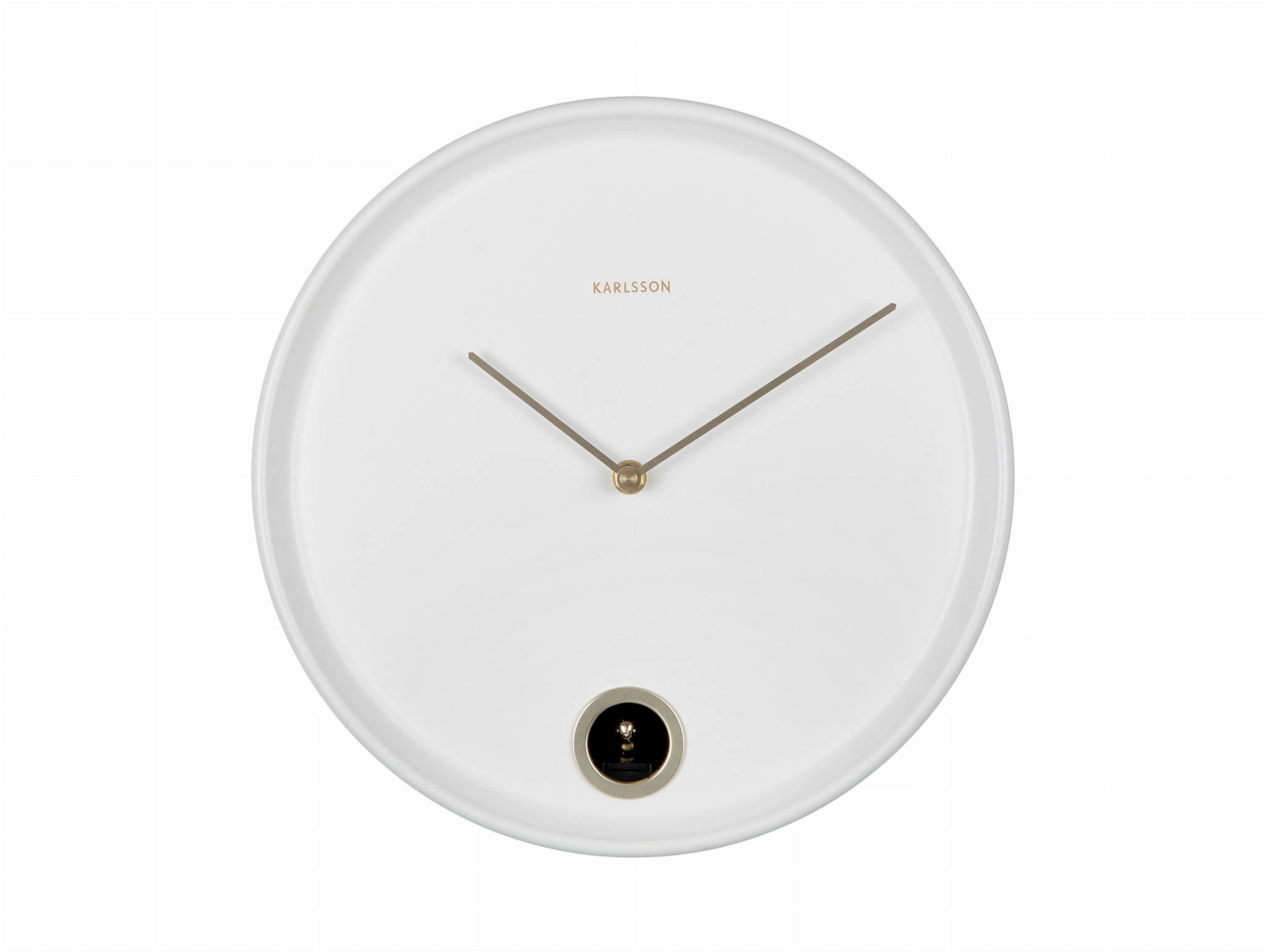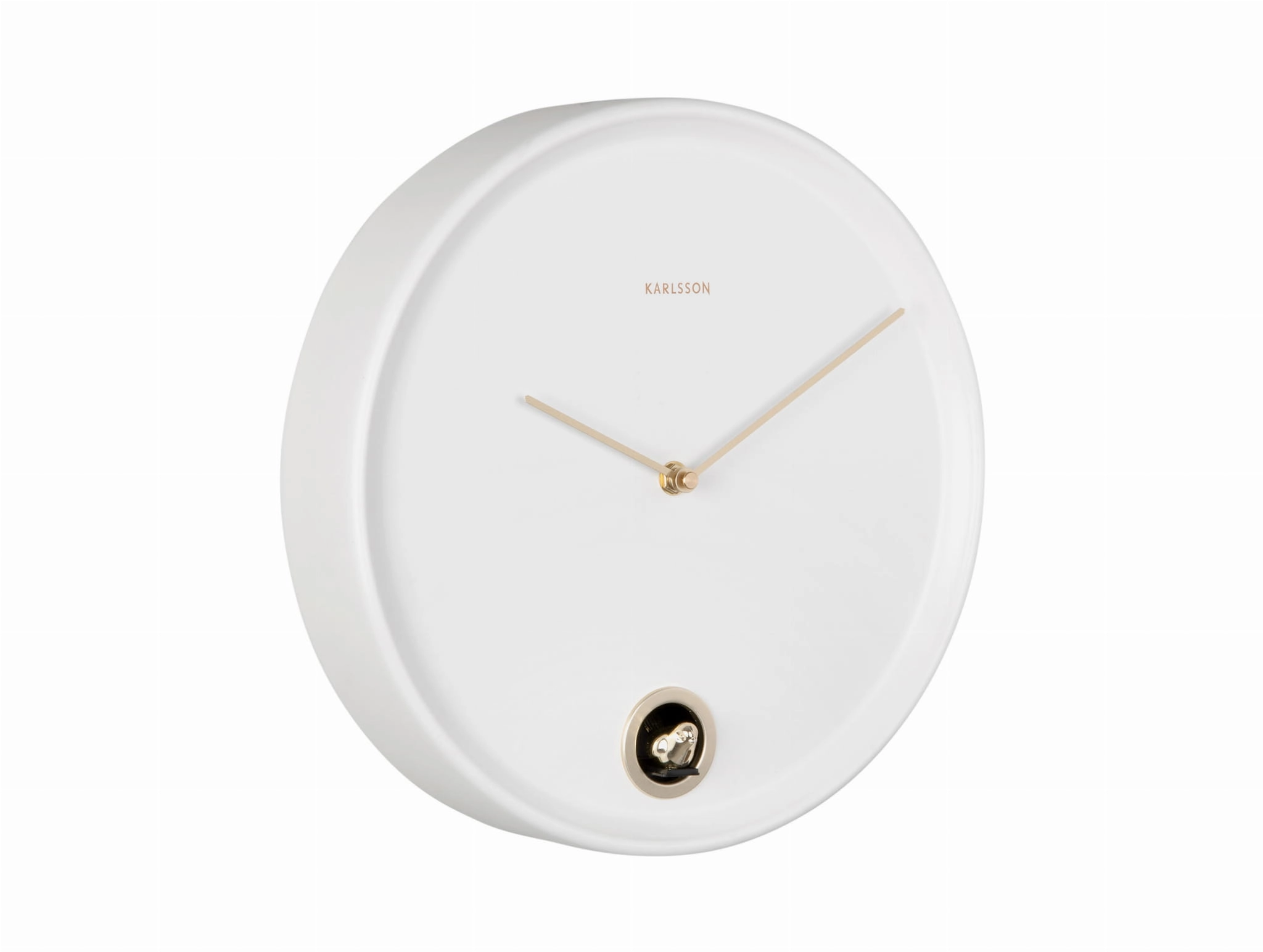 ESENCIA CUCKOO to zegar ścienny z kukułką, który łączy spokojną formę, biały metalowy korpus i delikatne złote detale. Jego okrągła bryła dobrze sprawdzi się jako nowoczesny zegar ścienny do salonu, kuchni, jadalni lub gabinetu.