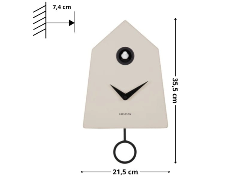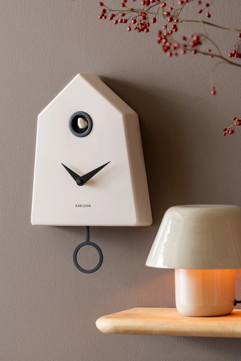 GRAFICO CUCKOO to zegar ścienny z kukułką, który łączy praktyczną funkcję odmierzania czasu z dekoracyjną formą inspirowaną klasycznym zegarem z domkiem. Ciepły beżowo-brązowy odcień obudowy, czarne wskazówki, widoczny element kukułki oraz dolne wahadło tworzą spokojny, graficzny efekt na ścianie. To beżowo-brązowy zegar ścienny, który dobrze komponuje się z drewnem, bielą, czernią, naturalnymi tkaninami i jasnymi aranżacjami.