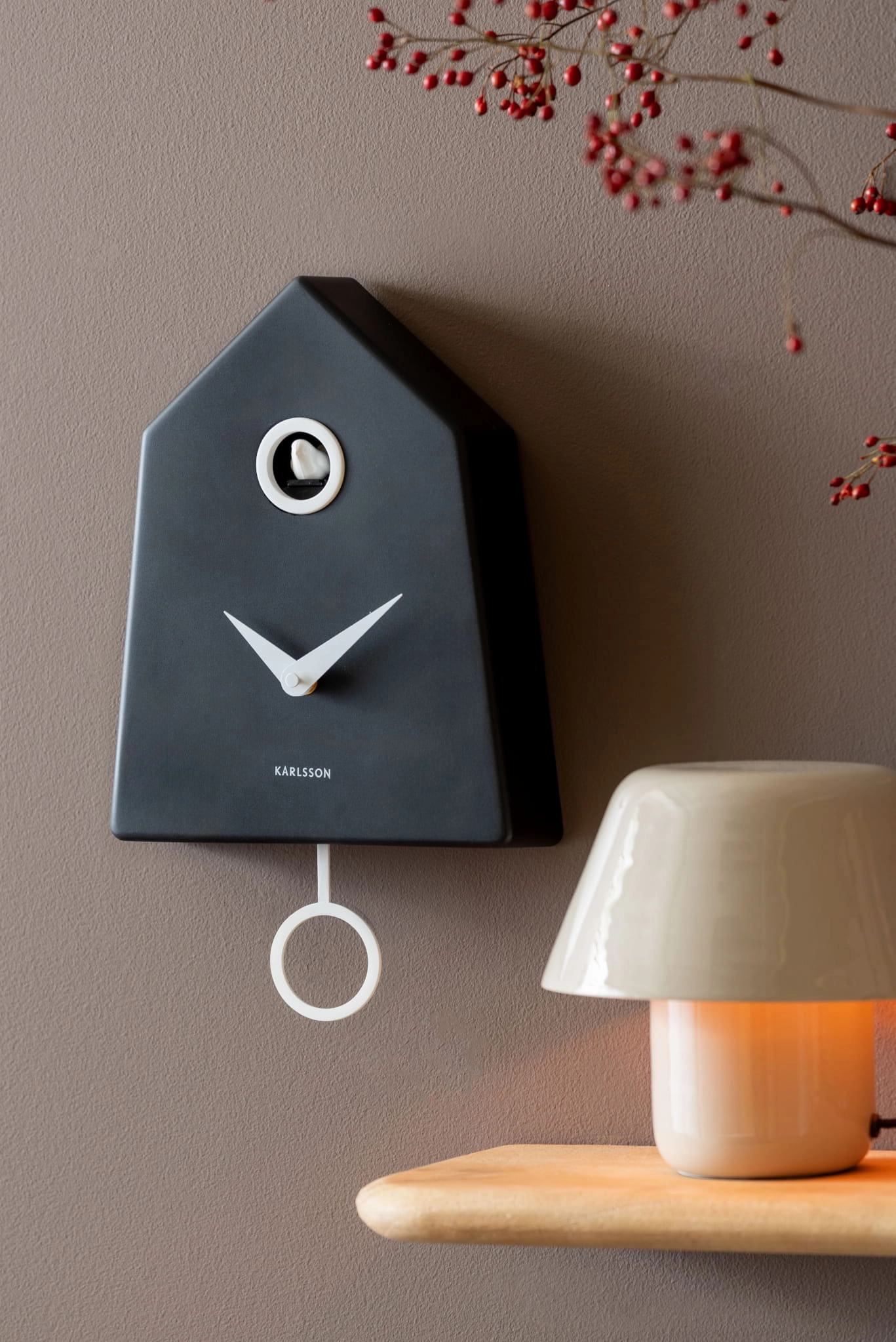 GRAFICO CUCKOO to zegar ścienny z kukułką, który łączy klasyczny motyw z nowoczesnym, prostym designem. Jego forma przypomina domek, ale została pokazana w bardzo graficzny i minimalistyczny sposób — bez ozdobnego nadmiaru, za to z mocnym efektem wizualnym.