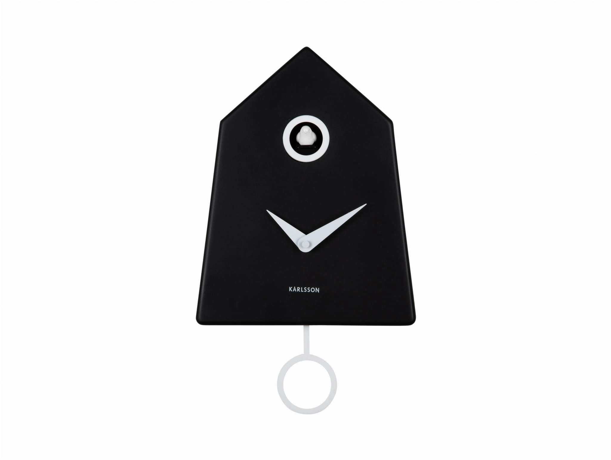Czarna obudowa sprawia, że zegar wygląda elegancko, wyraziście i nowocześnie. Białe wskazówki, wahadło oraz okrągły detal przy kukułce tworzą kontrast, dzięki któremu model dobrze prezentuje się na jasnej ścianie, przy drewnie, beżu, szarości, bieli oraz metalowych dodatkach.