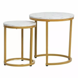 Szukasz efektownego dodatku, który wzbogaci aranżację salonu lub pokoju wypoczynkowego? Zestaw ław HOLA biały marmur/złoty to wyjątkowy komplet, który łączy w sobie nowoczesny minimalizm i szyk glamour. Okrągłe blaty z subtelnym wzorem marmuru pięknie komponują się ze złotym metalowym stelażem, tworząc spójną i stylową całość.