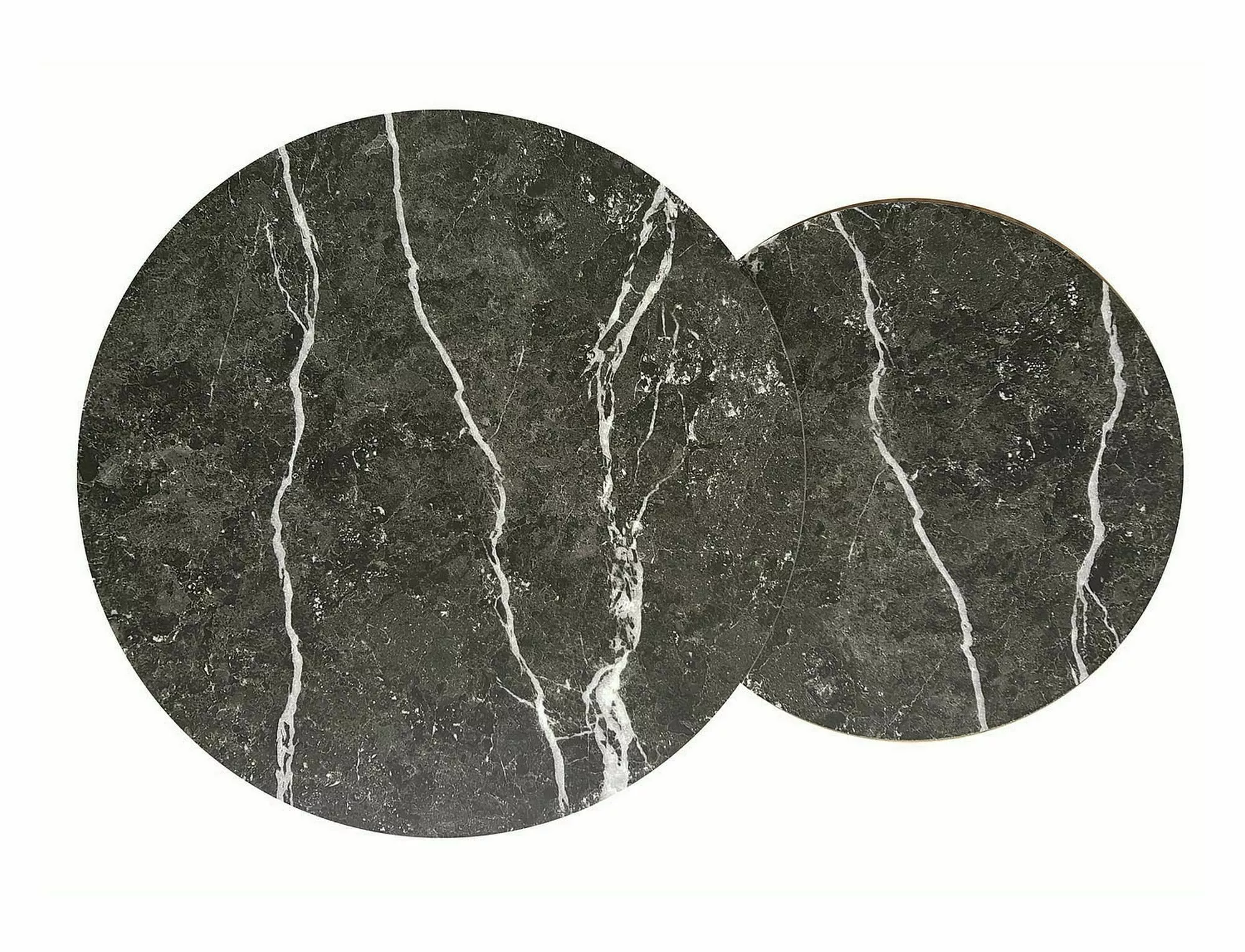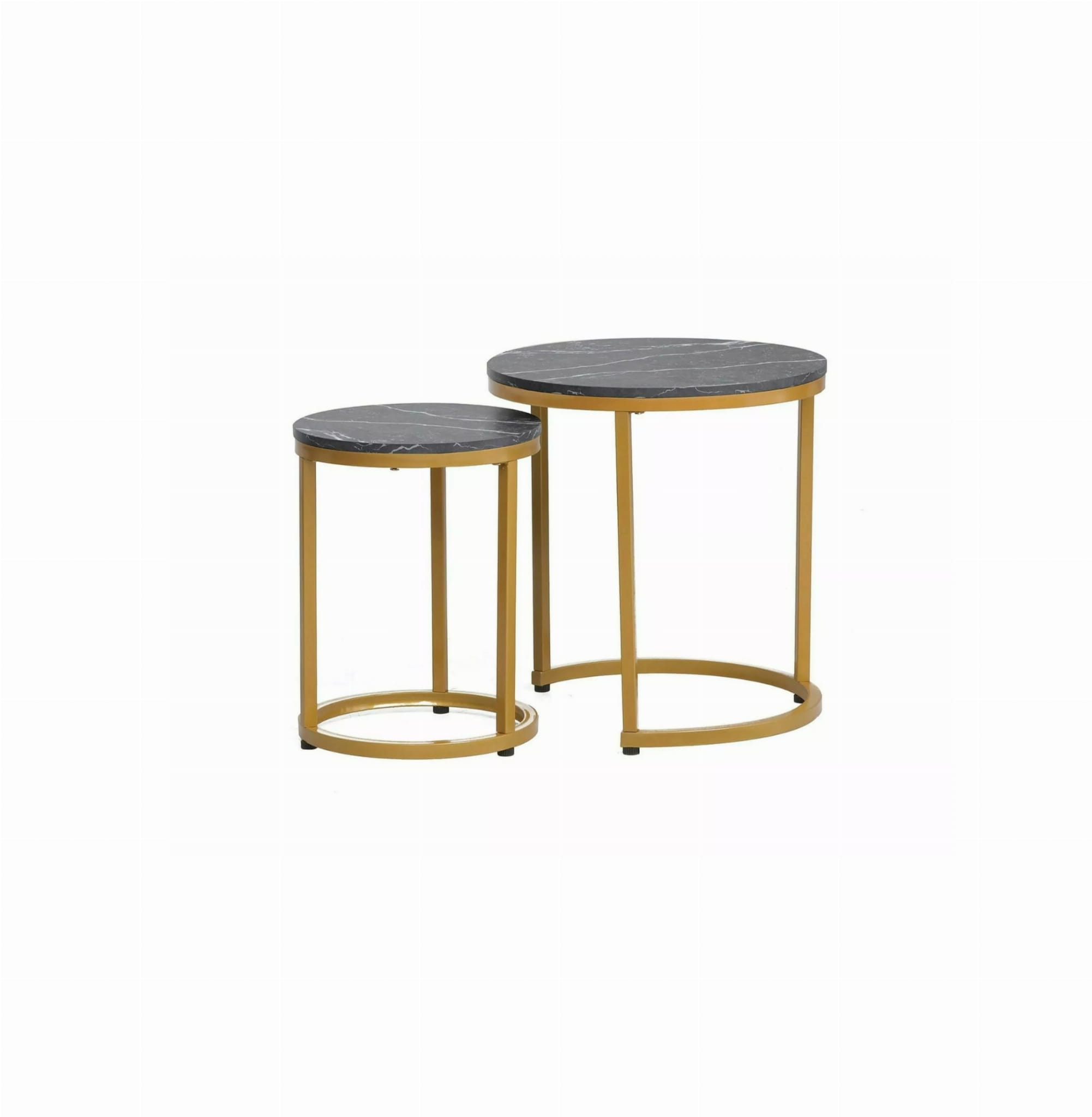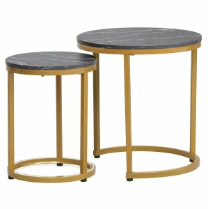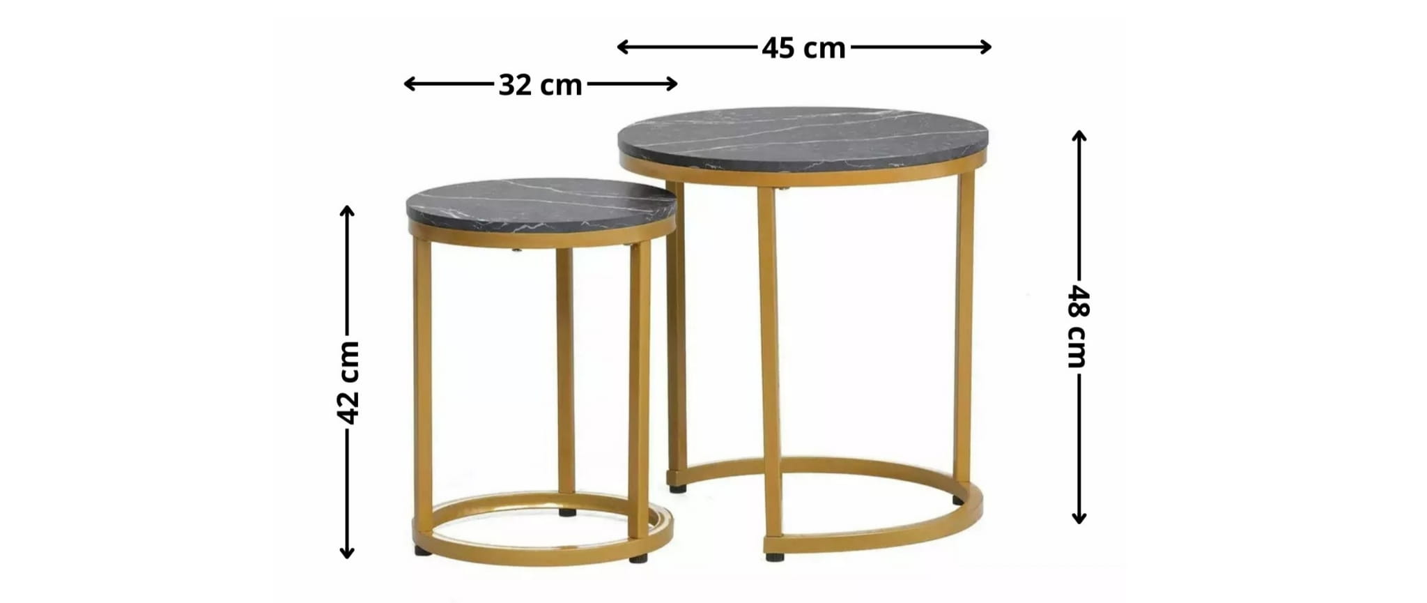 Kombinacja czarnego blatu z efektem marmuru i metalowego stelaża w kolorze złotym tworzy ponadczasową estetykę inspirowaną stylem glamour. Okrągłe kształty stolików są bezpieczne dla dzieci i wygodne w codziennym użytkowaniu. Dzięki niewielkim wymiarom, stoliki świetnie sprawdzą się zarówno w przestronnych, jak i mniejszych pomieszczeniach.