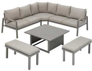 To więcej niż tylko meble – to komfortowy komplet ogrodowy dla 8–10 osób, który łączy funkcję jadalnianą i wypoczynkową. Dzięki regulowanej wysokości stołu możesz z łatwością zmienić stolik kawowy w miejsce do rodzinnego obiadu. Aluminiowy stelaż gwarantuje trwałość i odporność na korozję, a grube poduszki z pianki zapewnią wygodę na najwyższym poziomie.