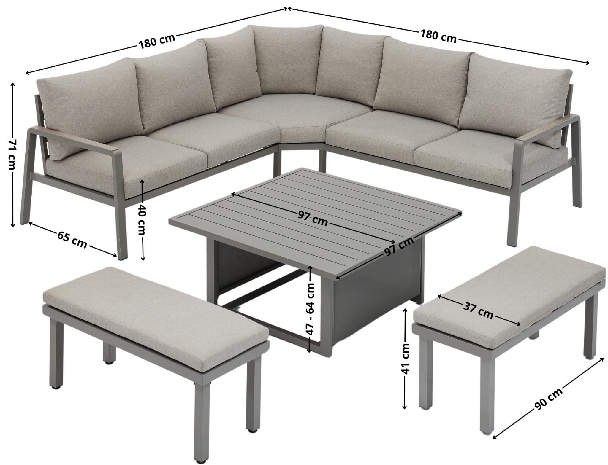 Poduszki z pokrowcami na zamek ułatwiają utrzymanie czystości, a kompaktowe ławki wsuwane pod stół to praktyczne i estetyczne rozwiązanie do mniejszych przestrzeni. To idealny wybór zarówno do przyjęć, jak i codziennego relaksu.