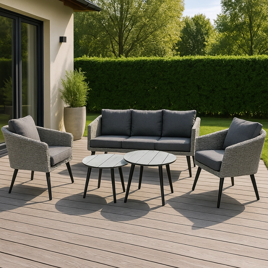 Zestaw mebli ogrodowych LOPEZ to połączenie nowoczesnego stylu, wysokiego komfortu i solidnego wykonania, które odmieni każdą przestrzeń na świeżym powietrzu. W skład kompletu wchodzi sofa 3-4 osobowa, 2 fotele oraz 2 praktyczne stoliki kawowe, dzięki czemu z łatwością stworzysz strefę relaksu dla rodziny i gości. Aluminiowy stelaż, technorattan oraz trwałe blaty z tworzywa imitującego drewno gwarantują odporność na warunki atmosferyczne. Grube poduszki zapewniają maksymalny komfort wypoczynku. Szary i czarny kolor zestawu wpasowuje się w większość nowoczesnych aranżacji ogrodowych.