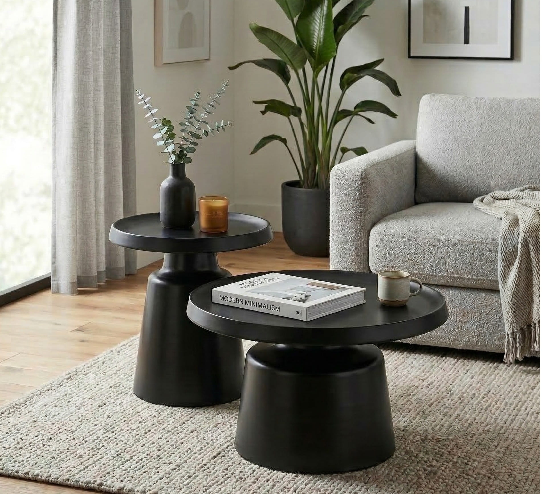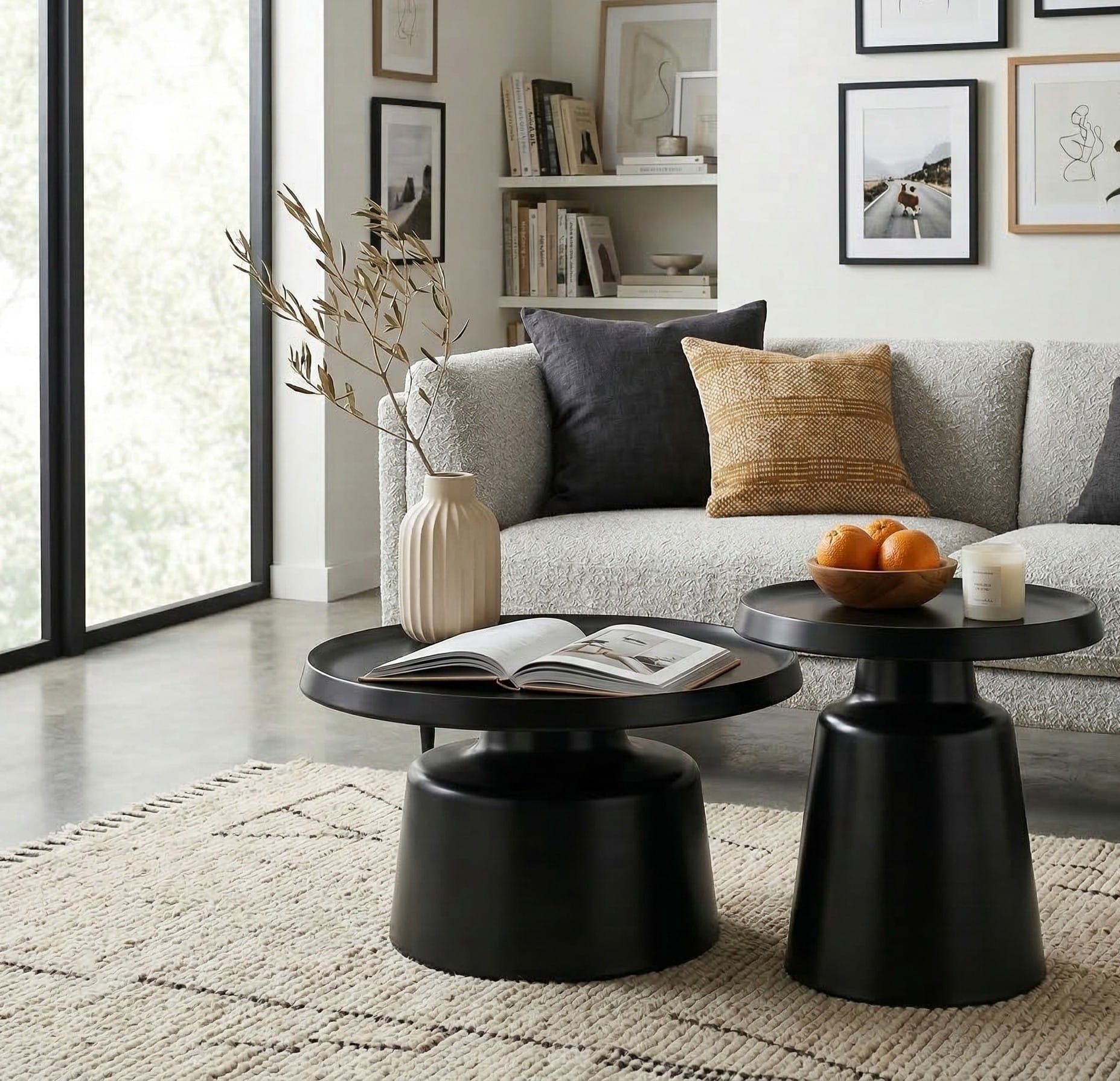 Czarny zestaw stolików kawowych LEMOS to połączenie wyrazistego designu i codziennej funkcjonalności. Doskonale sprawdzi się jako okrągłe stoliki kawowe do salonu, podkreślając nowoczesny styl wnętrza i tworząc spójną, elegancką przestrzeń.
